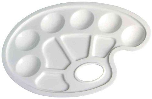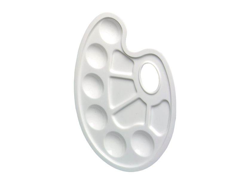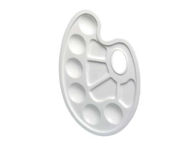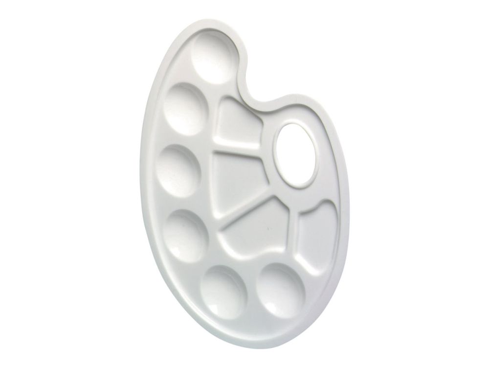 This plastic mixing palette, measuring 23.5 x 17 centimeters, has a handle hole and a total of 10 recesses for color. Six color fields are complemented by four fields for mixing.