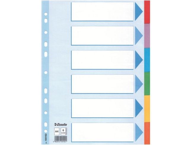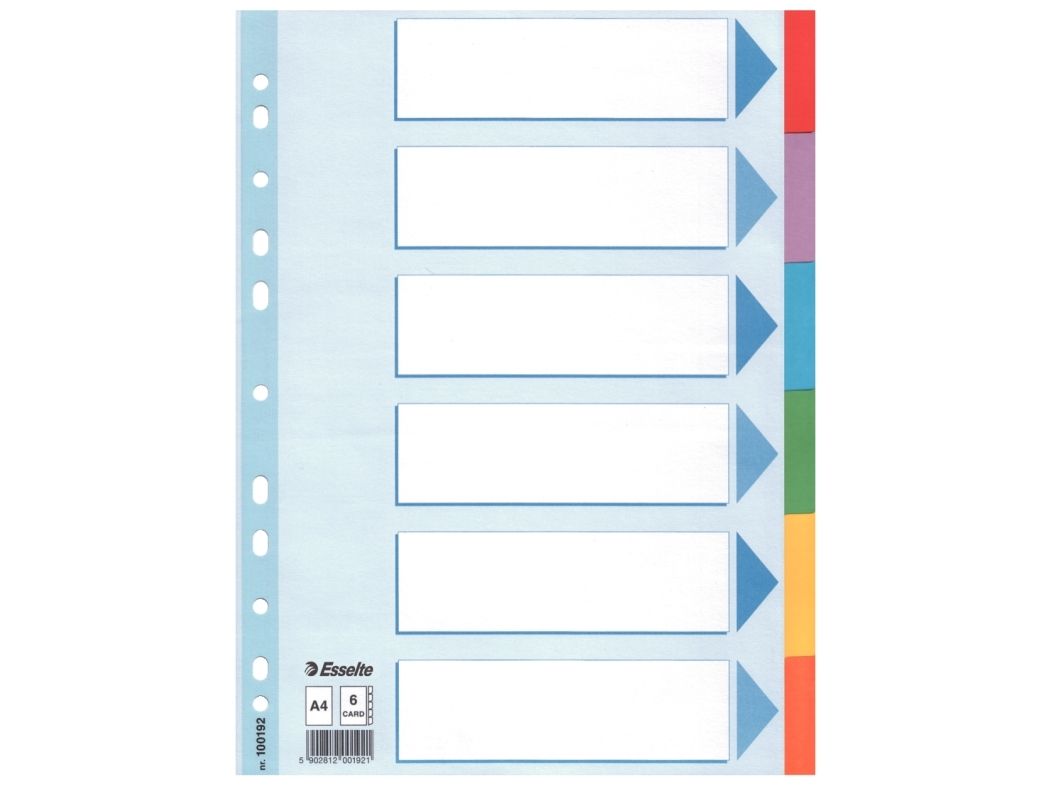 - Reinforced punched strip on front sheet - Blue Angel recycled cardboard - 6 coloured tabs for easy sorting - 11 hole universal fit - A4 format - Strong 160 gsm cardboard