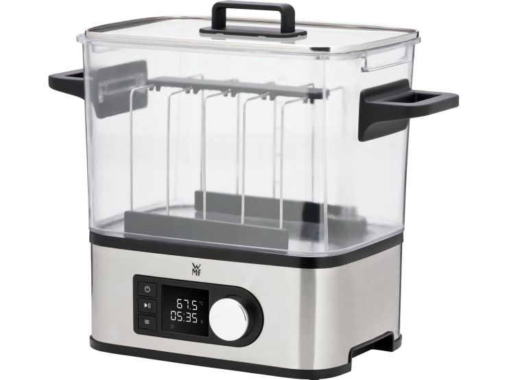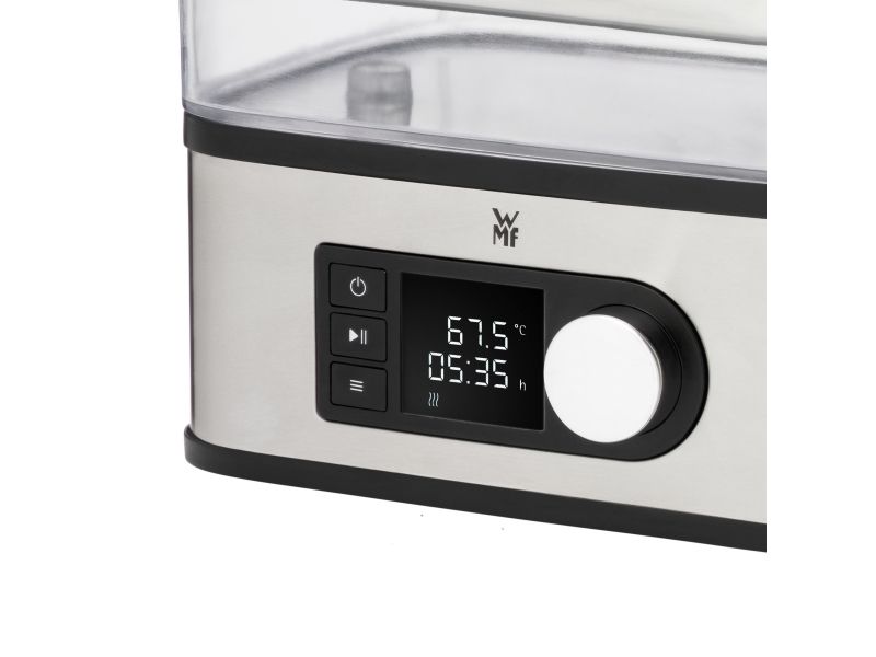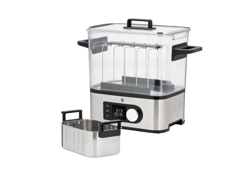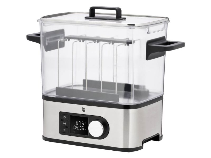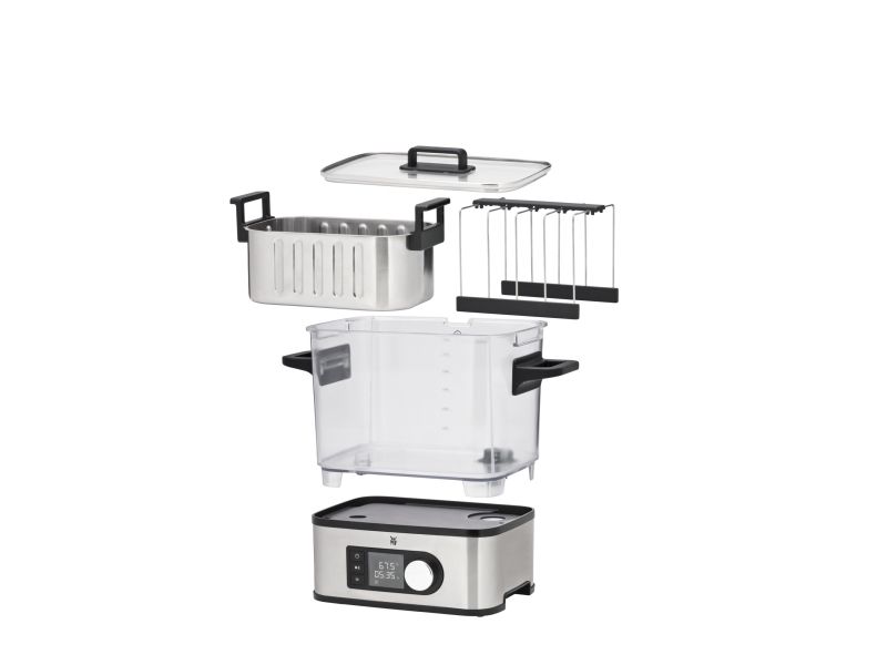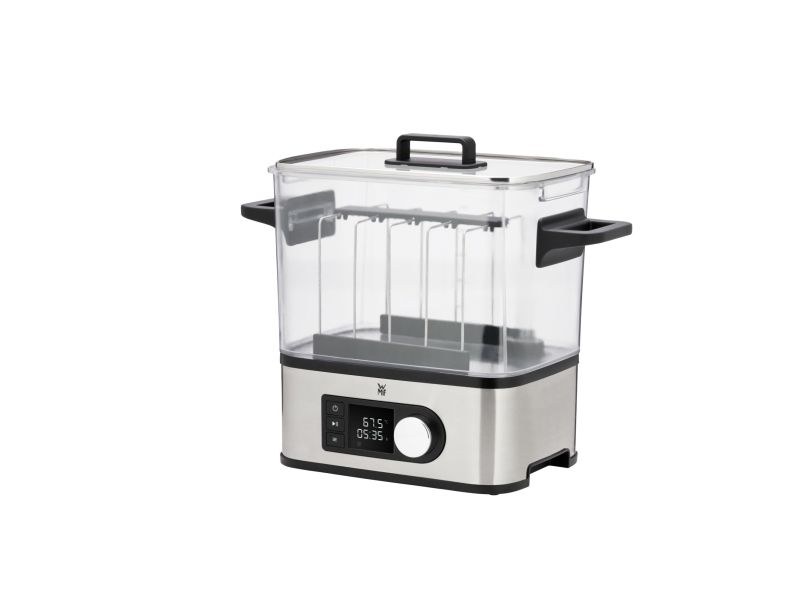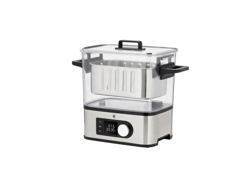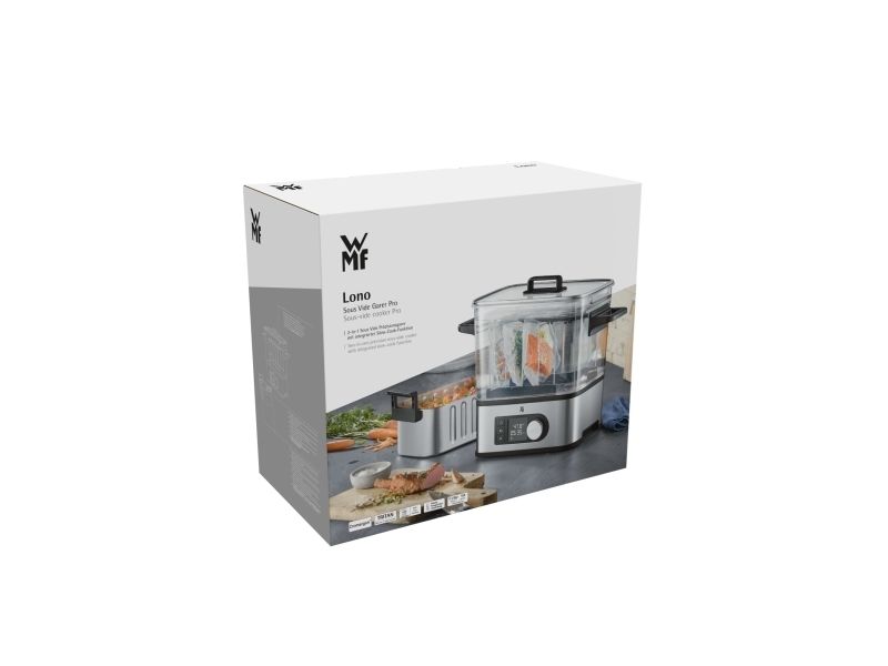 en kabellængde på drejeknap LC-display. 1,2 m. WMF LONO Sous vide Garer Pro imponerer med to essentielle funktioner til gourmetkøkke: For det første den præcise temperaturindstilling og høj temperaturnøjagtighed, der er nødvendig til Sous vide madlavning. Og så er der mulighed for at bruge enheden til en stadig mere populær Slow-Cooking. Den variable temperaturstyring muliggør et område fra 35° C til 90° C, timer-funktionen giver op til 72 timers skånsom tilberedningstid. Takket være WMF Easy handling er 6-liters vandbeholderen i BPA-fri tritan nem og sikker at tømme. Nem betjening med en drejeknap og et godt læsbart LC-display. To frit justerbare programmer til hyppige anvendelser garanterer altid perfekte tilberedningspunkter. Det flotte kabinet og den 3 liter store Slow-Cook-anvendelse er fra Cromargan® af høj kvalitet.
