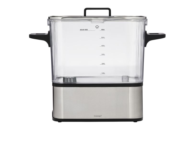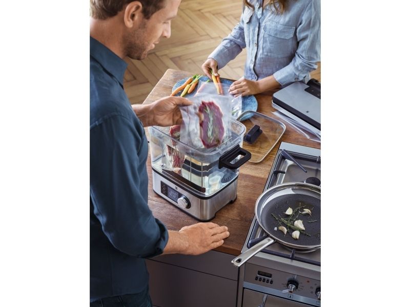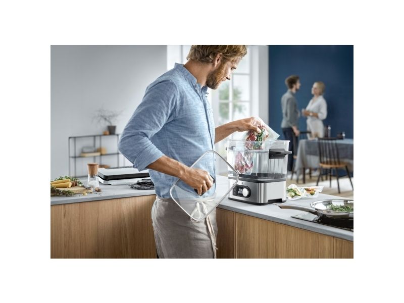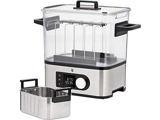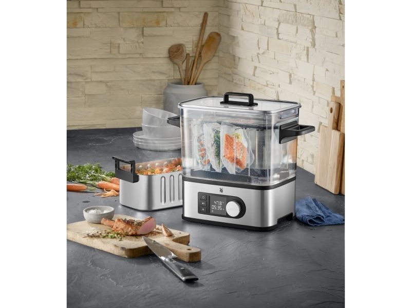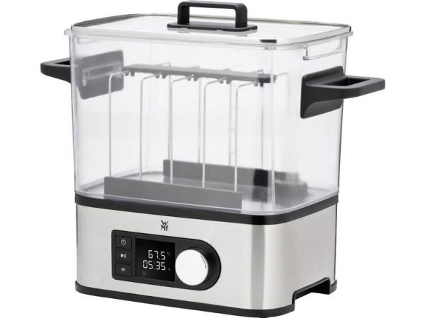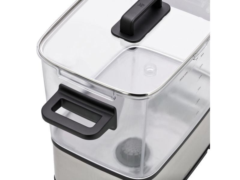 LONO Sous vide Garer Pro Kabinet af højkvalitets Cromargan® vandtank med 6 liter kapacitet af BPA-frit transparent tritan 2-i-1-funktion: Sous vide og Slow Cooker i ét apparat - nem og skånsom tilberedning af fisk Kød og grøntsager som i gourmetüche 2 programmerbare indstillinger for en perfekt temperatur meget præcis temperaturstyring og høj temperaturnøjagtighed variabel temperaturindstilling fra 35° C til 90° C til ensartet temperatur i hele vandbeholderen timer-funktion op til 72 timers Gartid WMF Easy handling: Store bæregreb på vandbeholderen for sikker håndtering , nem håndtering og komfortabel betjening via