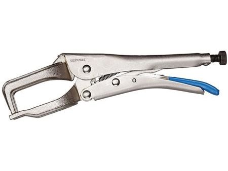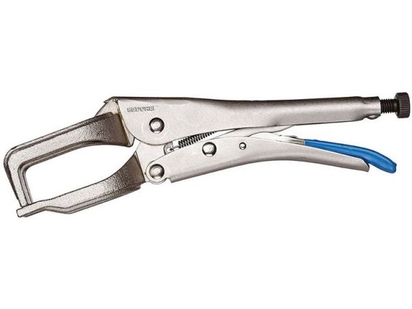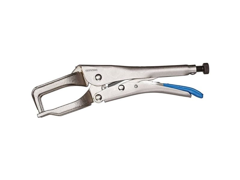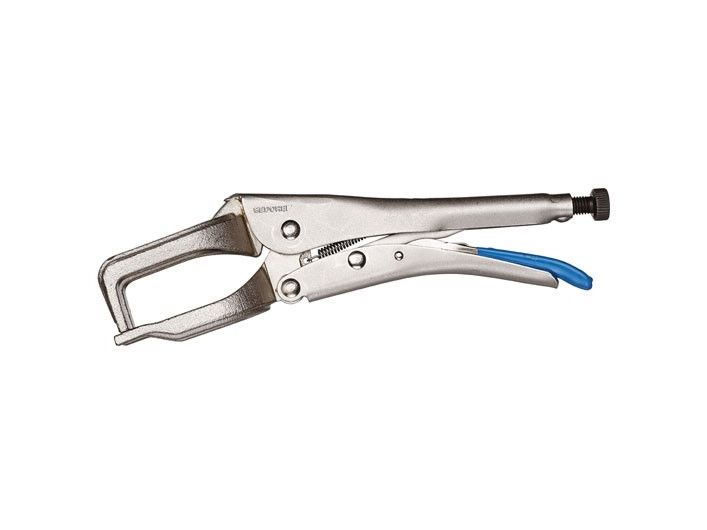 For clamping strips and profile sections when welding. Cast steel jaws. Nickel-plated. Release lever blue dip-insulated.