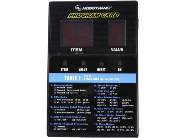 This LED program box is for programming HobbyWing brushless ESCs. Its friendly interface makes ESC programming easy and quick.