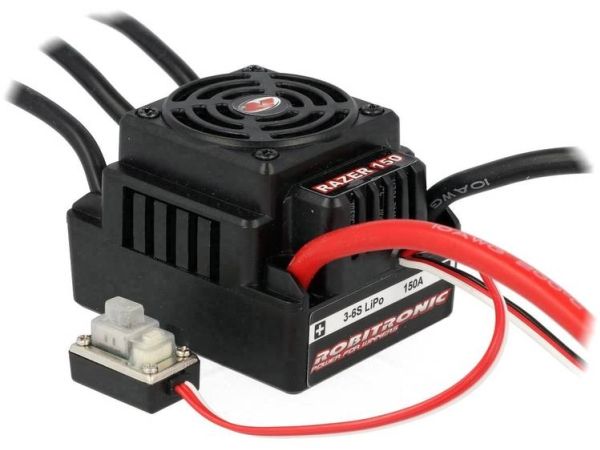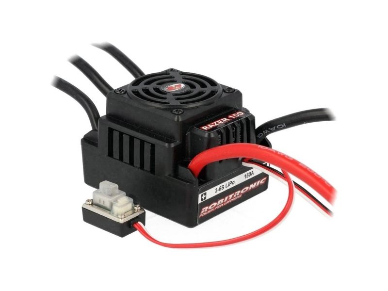 Brushless-hastighedsregulator Razer eight 150 A 3-6S Fuldt vand- og støvtæt tænd/sluk-kontakt med setup-tast S-BEC med 6V og 5A topstrøm plug and Play, batteri og motorstik allerede loddet flere beskyttelsesanordninger: Underspændingsfrakobling, termisk beskyttelse og beskyttelse ved signaltab . Nem programmering via Setutaster separat programmeringsport, enkel forbindelse af LED-programkortet (valgfrit) Razer eight 150A regulator har alle vigtige funktioner og indstillingsmuligheder, som ønsker en ambitiøs 1/8-pilot. Takket være den fremragende kvalitet får du en regulator med højeste pålidelighed og optimal effektivitet til anvendelse i alle 1/8-klasser.