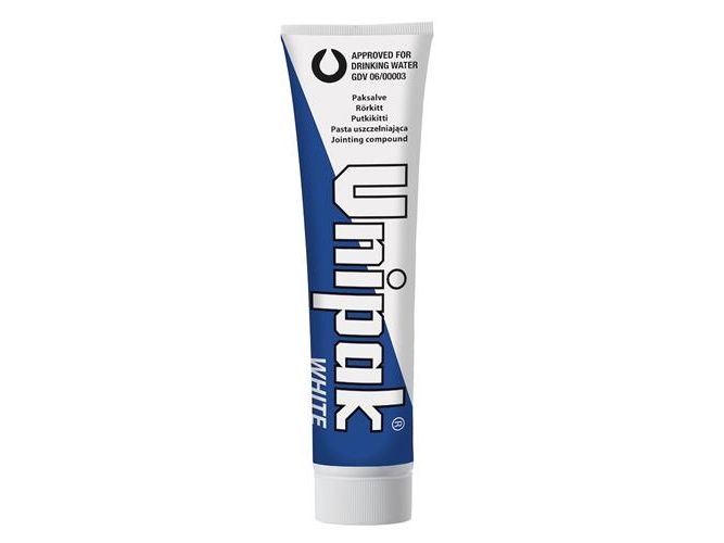 Unipak WHITE smitter ikke af og hærder aldrig, så rørsamling let kan adskilles.Unipak WHITE anvendes med Unigarn til tætning og gevindsamling af drikkevands- og varmeinstallationer.