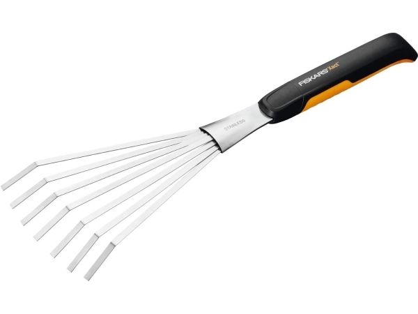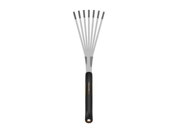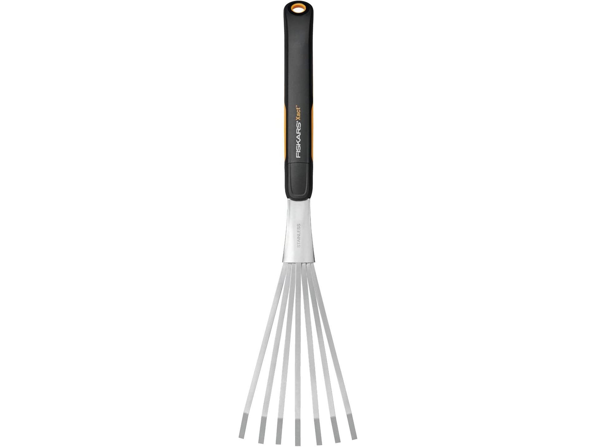Fan-shaped Xact™ hand rake is the perfect tool for raking up leaves, weeds and grass cuttings in small flowerbeds and hard-to-reach areas. Perfectly finished stainless steel head with seven prongs provide ultimate precision and control. Comfortable handle design with SoftGrip allows multiple handle positions during use, and longer handle brings perfect balance and extra leverage power when needed.