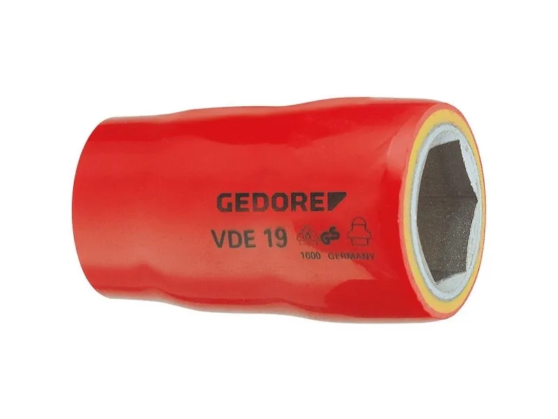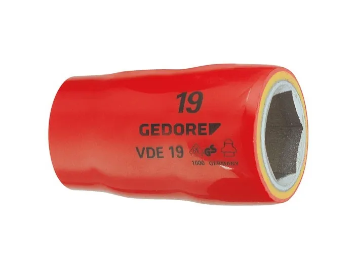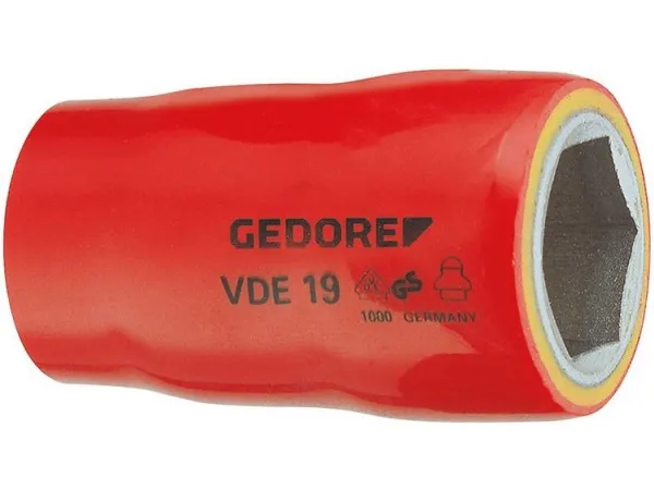 Hexagon socket wrench, hand-operated. With square drive according to DIN 3120 - C 12.5, ISO 1174. Gedore vanadium steel 31CrV3. VDE insulation up to 1000 V, acc. to EN 60900/IEC 60900, two-ply Check-Tool insulation. 16 - 18 mm insulation overhang. Sizes 27, 30 and 32: diameter d1 is not standardised.
