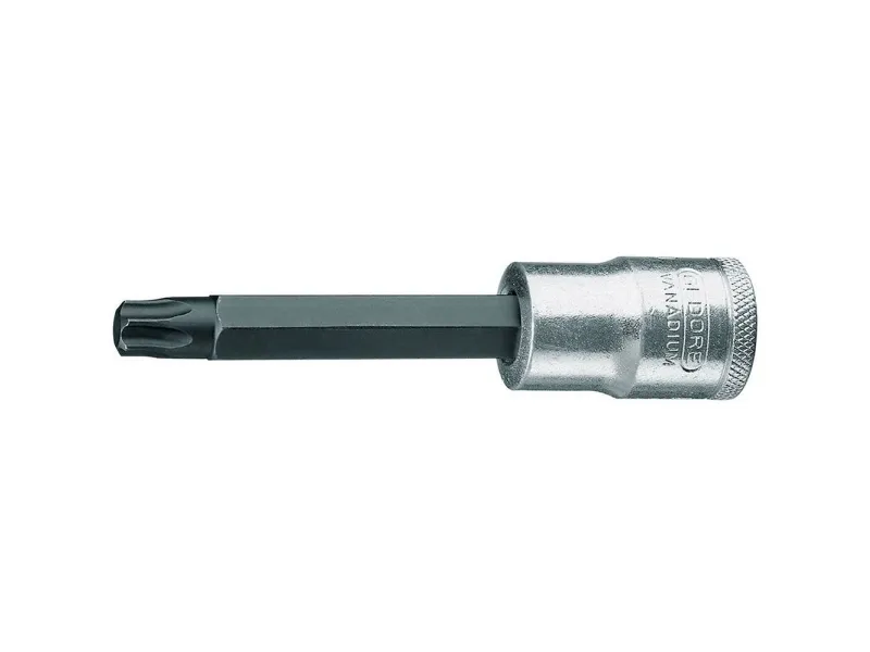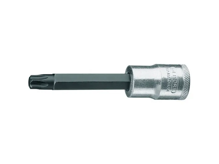 Square drive as per DIN 3120 - C 12.5, ISO 1174, with ball retaining groove. Hand-operated, knurled grip. Chrome-plated. With pressed-in pin in Gedore vanadium special steel, gun-metal finish. TORX® = reg. trademark of Acument Intellectual Properties, LLC. USA.