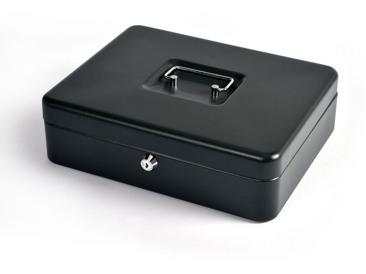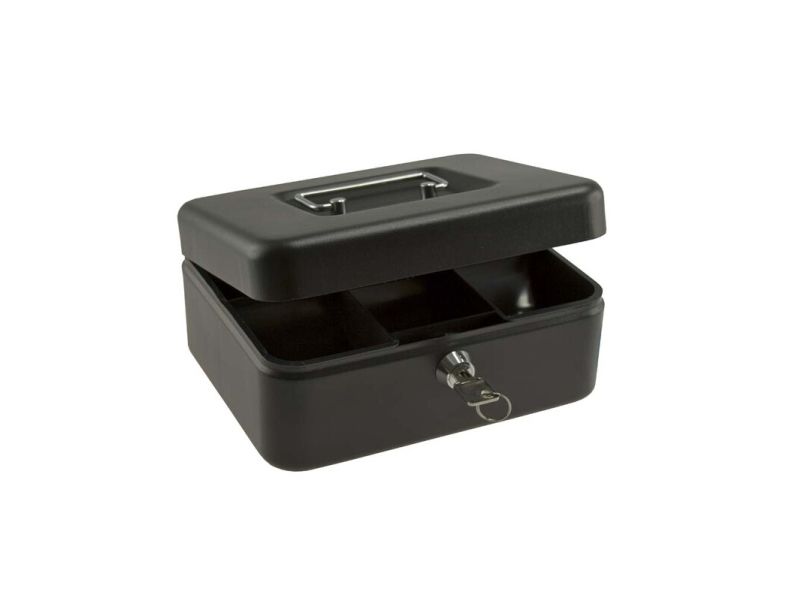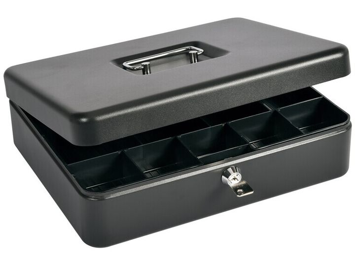 St�bt plade med b�reh�ndtag, indvendig kasse i plast med 6 m�ntrum.