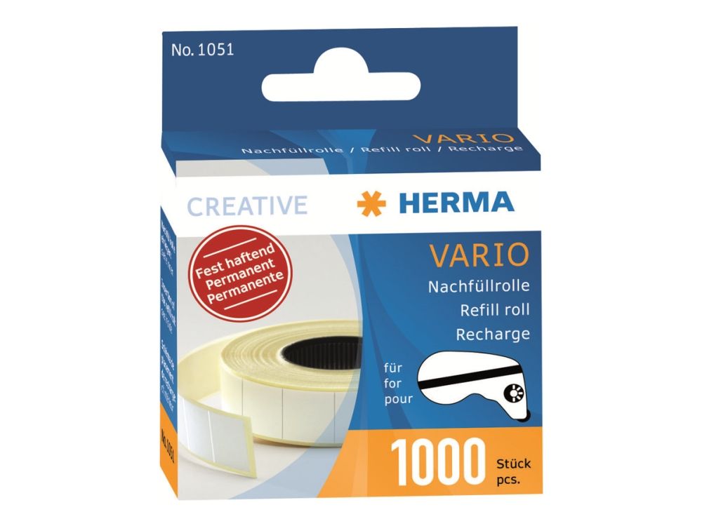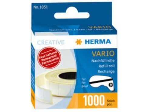 Applies 1000 self-adhesive double-sided paper stickers. In row or piece by piece. For the rapid and permanent mounting of photos, receipts, documents and all other things which should be mounted in or on. Also suitable for handicrafts. With the practical HERMA Vario refill roll the dispenser is ready for use immediately again: open dispenser, insert refill roll, close - ready.