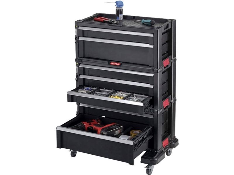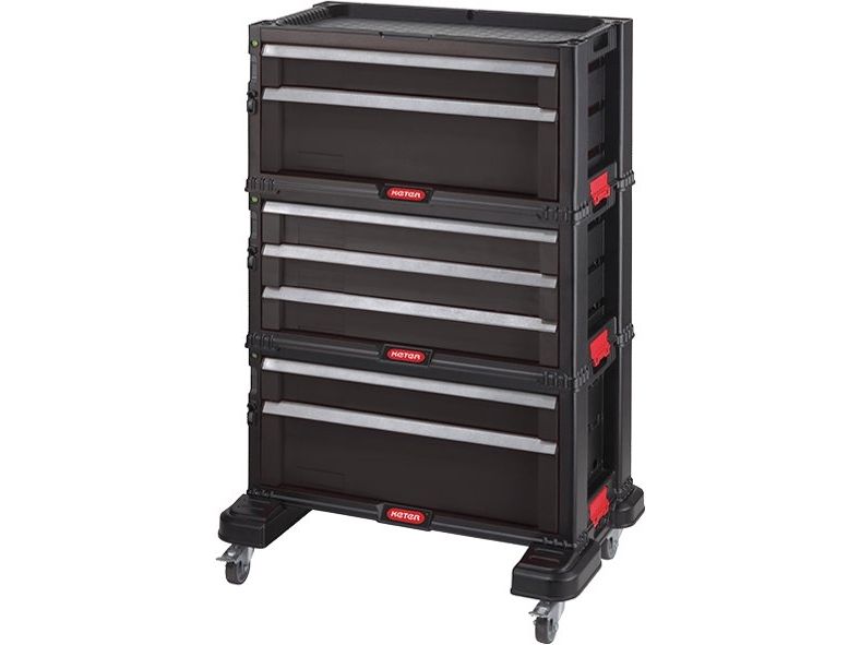 KETER værktøjsvogn med 7 skuffer i sort Mobil konstruktion med rullehjul for større komfort · Den integrerede værktøjsbakke på oversiden har plads til smådele, værktøj og tilbehør, så du altid har disse ved hånden under arbejdet · Kompatibel med elementerne i KETER skuffeserien - muliggør alsidig stabling med andre KETER skuffeenheder takket være den enkle låsemekanisme.