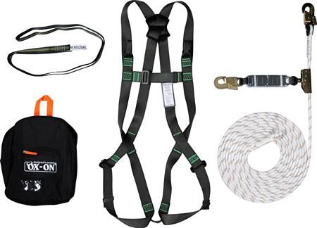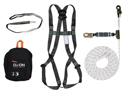 Basic faldsikringssæt (komplet) i taske. Velegnet til eksempelvis tagarbejde. Indeholder: 348.01 OX-ON Basic helsele. 355.82 OX-ON arbejdsline 10m. 348.54 OX-ON polyester sling 120 cm. 5056100 OX-ON taske str. S