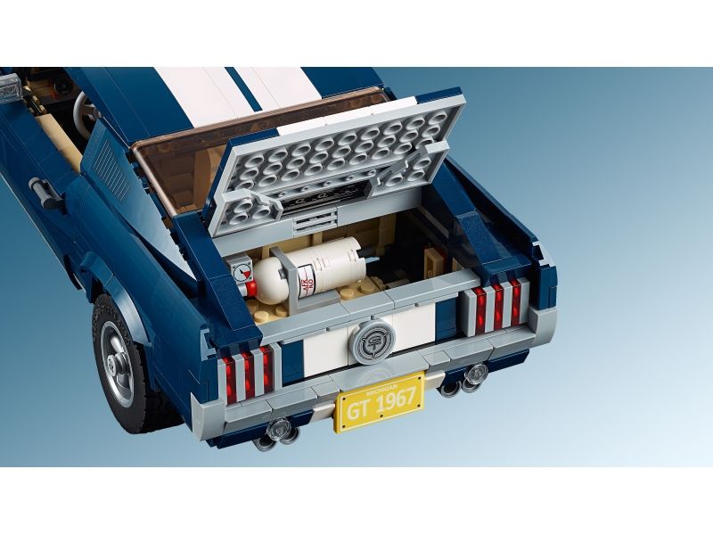 Med settet LEGO® Creator Ford Mustang kan du oppleve magien ved en av 1960-tallets ikoniske amerikanske muskelbiler. Modellen har mørkeblått karosseri med hvite racerbilstriper, kjøleluftinntak på panseret, Mustang-logo på grillen, GT-emblemer og kraftige dekk med 5-eikers hjulkapsler. Denne autentiske modellen er utviklet i samarbeid med Ford og inkluderer tilbehør for valgfri tilpasning av bilen, blant annet flere bilskilt, turbolader, bakspoiler, store eksosrør, frontspoiler og dinitrogenoksidtank. Du kan justere høyden på bakakslingen for enda tøffere stil! Åpne dørene eller ta av takpanelet for å få tilgang til det detaljerte interiøret med stilrene seter, radio, fungerende styring og midtkonsoll med girspak! Legg utstyret ditt i bagasjen, og åpne panseret for å inspisere bilens detaljerte «big block» 390 V8-motor med batteri, slanger og luftfilter. Dette avanserte byggesettet er utviklet for å gi byggere en utfordrende og tilfredsstillende byggeopplevelse full av nostalgi. Modellen fungerer perfekt som blikkfang både hjemme og på kontoret.