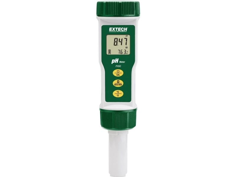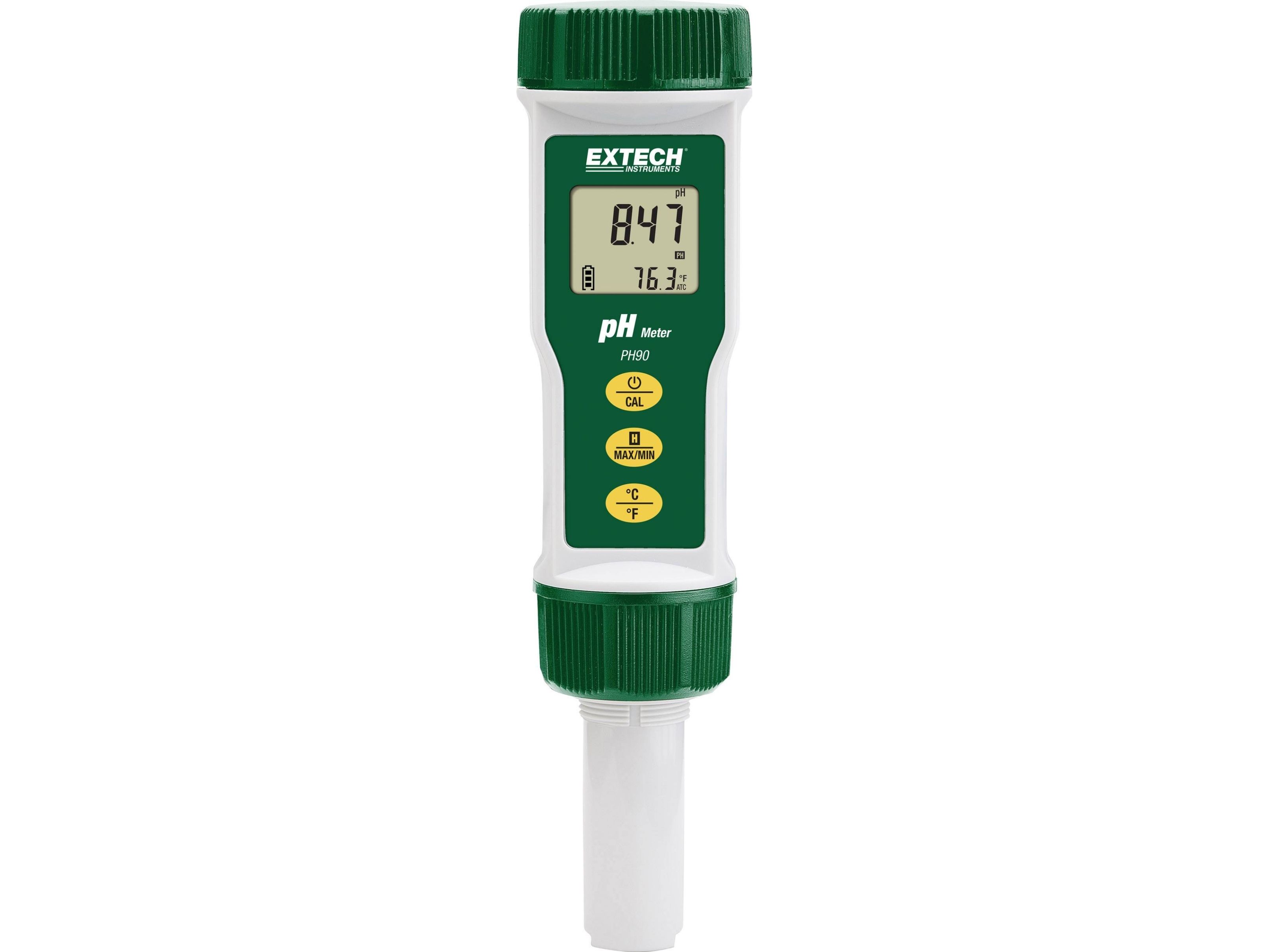 PH-måleapparat PH90 Robust udskiftelige flade overflade pH-elektrode til hurtige pH-målinger på stedet. Samtidig visning af pH og temperatur. 2 eller 3-punkts-kalibrering registrerer automatisk bufferopløsninger (pH-bufferlager, bestilles separat). PTS (procent af stigning) fortæller dig, hvornår det er tid til at erstatte dine elektrode (under 70 % eller over 130%) PH90 er en vandtæt pH-metre. Med et robust, vandtæt (IP57) kabinet med flad overflader elektrode til måling af pH-værdien i væsker, halv faste stoffer og faste stoffer og viser også temperatur på det store LC-display. Den rubuste elektrode afrivning ikke eller tilstoppet som almindelige glaskolbens føler. Der er nem at montere, ersetzender sensor er ideel til arbejds- eller laboratoriet brug. Med en 2- eller 3-punkts-kalibrering, som automatisk bufferopløsninger registrerer og rapporterer (PTS procentdel af hsv), hvornår det er tid til at erstatte den elektrode. Komplet med flade overflader-pH-elektrode, beskyttelseskappe og to 3V CR-2032 knapcellebatterier (pH-bufferopløsninger er påkrævet til kalibrering - sælges separat).