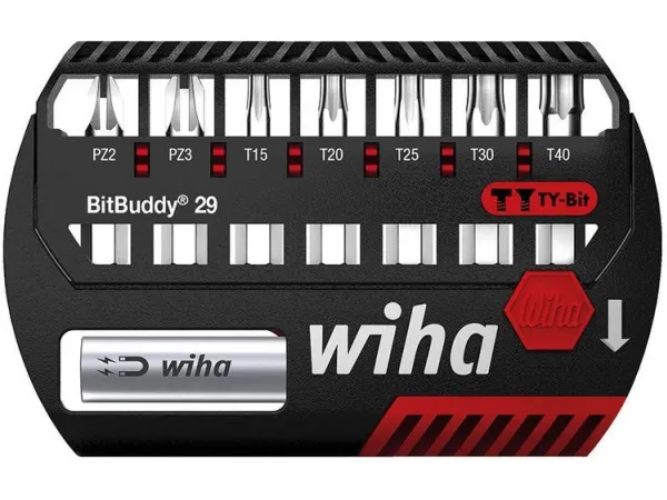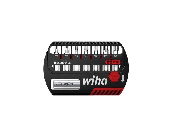 Tired of having no hand free and searching for the right bit in vain? The Wiha BitBuddy® allows you to position bits directly in the machine and return them to the holder easily. With its strong magnet, the bit holder contained in the set allows you to handle the buddy using a single hand thanks to its innovative design. The pioneering arrangement of bits in the holder and the lasered profile size on the bit base ensure that it is extremely simple to select the right size when removing the bit from the holder. Universal in its use, the multitalented TY bit is suitable for all types of screws – both T-shaped and Y-shaped screws – and thus the ideal tool for fastenings in all kinds of materials. Thanks to its patented torsion zone, the bit is also suitable for power tools and impact screwdrivers and guarantees a 120x greater lifespan compared to Wiha standard bits. The coloured bits are also quick and easy to find, even in the dark by using an UV light, thanks to its fluorescent coating. This reduces the number of bits which are lost and saves on the expense of acquiring new ones.