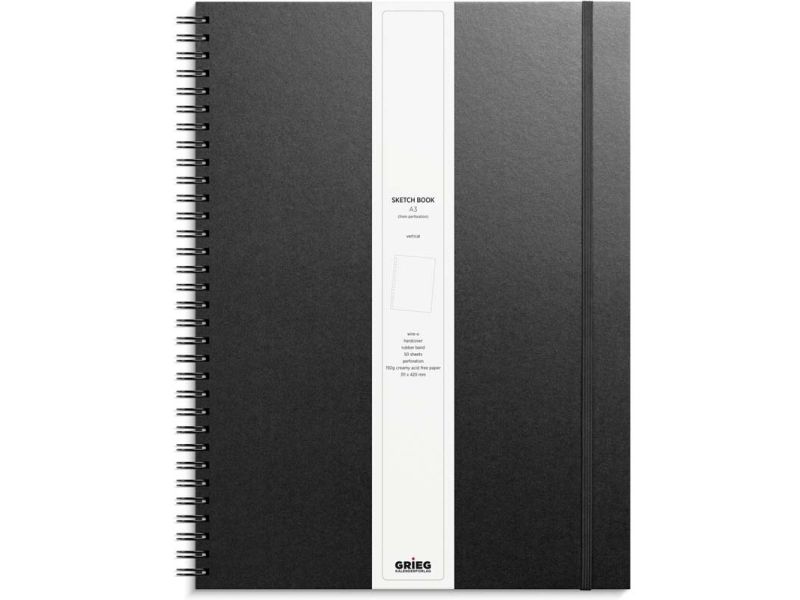Skitseblok med hårdt kunstskindsomslag, elastik. Syrefrit papir. Cremefarvet, ulinjeret, 150 g, 50 blade. Spiralindbundet. papirformat efter perforering: A3