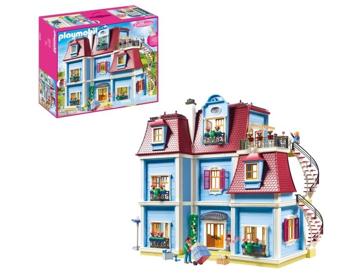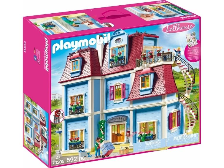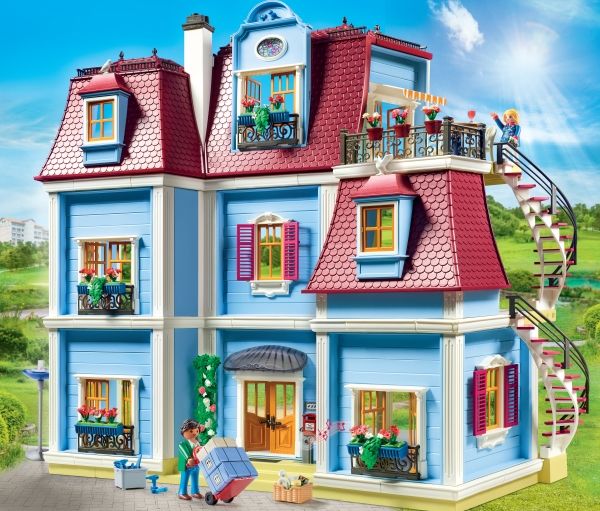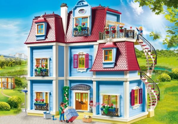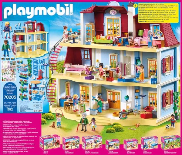 Flyt ind i det nye hjem! Med tagterrasse, spiraltrappe, funktionsdygtig dørklokke (2 x 1,5 V-microbatterier påkrævet). Perfekt til kombination med de seks behagelig værelser til indretning. Mål: 68 x 36 x 62 cm (LxBxH). Mit store dukkehus fra PLAYMOBIL® er fuldt af liv! Alle i familien føler sig godt tilpas i det nostalgiske hus. Mange store rum i to etager og tagetagen kan indrettes efter smag og behag, og med klistermærker der kan tages af kan man hurtigt ændre dem. Når der kommer gæster, bruger de den funktionsdygtige dørklokke. Og de første breve ligger allerede i postkassen. Efter flyttekasserne er pakket ud slapper familien af og nyder udsigten på den dejlige tagterrasse. Legesættet indeholder to PLAYMOBIL®-figurer, et dukkehus med plads til op til seks rum og en tagterrasse med udvendig vindeltrappe, en funktionsdygtig dørklokke og en postkasse, der kan åbnes, samt meget andet tilbehør. Inklusive ark med klistermærker med tal- og navnemærker til husdøren og mange billed- og smykkeklistermærker til pynt på væggene, som kan genbruges. Dukkehuset kan indrettes med seks hyggelige rum