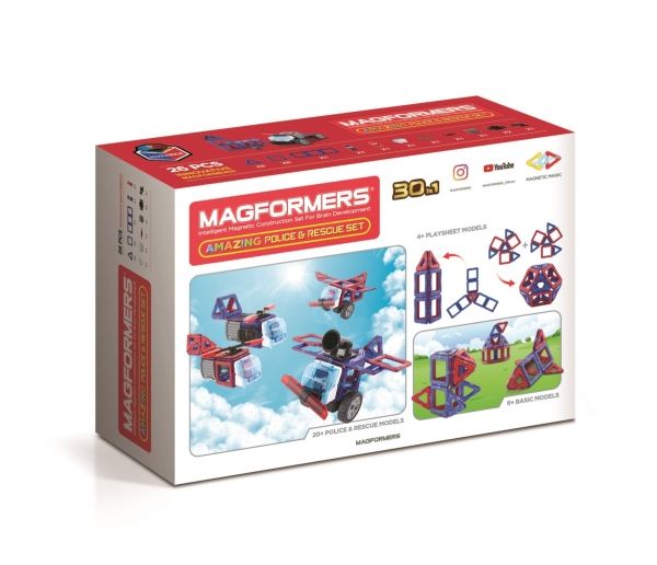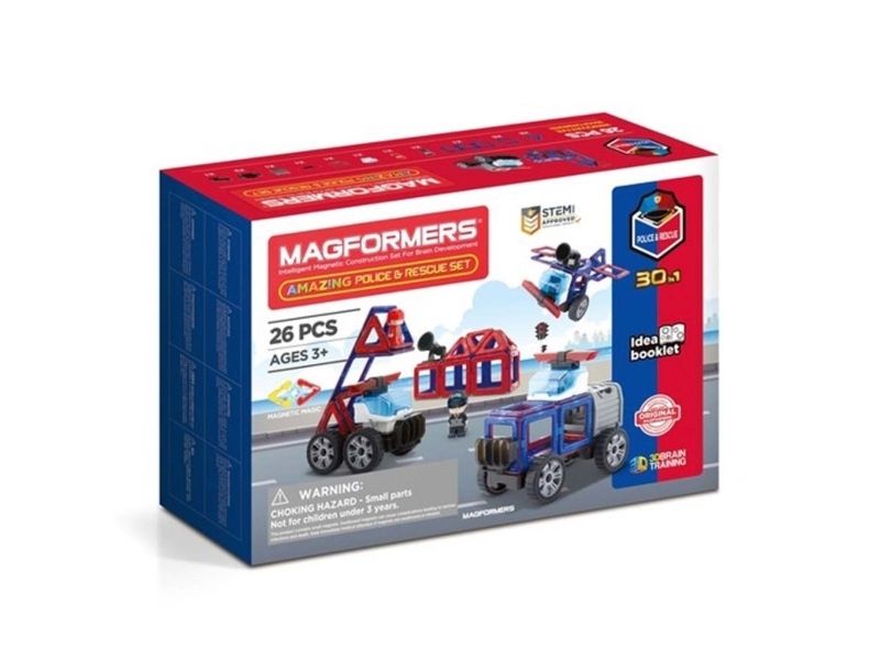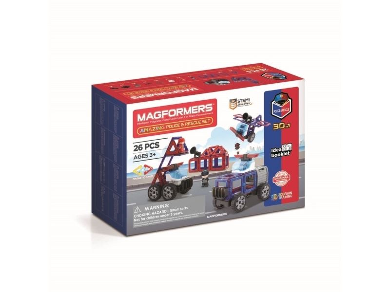 Magformers politi og regning sæt med 26 dele og en brochure til at bygge efter. Gør det muligt at bygge 30 forskellige konstruktioner.