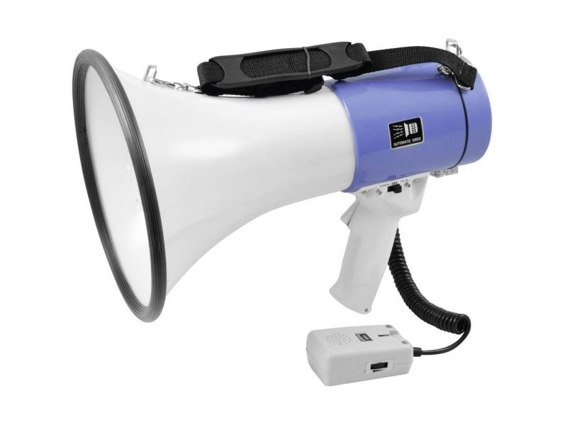 Gør din stemme hørt! · Kraftig 25W megafon med sirene · Plug-hånd mikrofon ved spiralkabel · Switchable sirene · Volumenkontrol · pistolgreb og skulderstrop · Høj kvalitet, hus (ABS) virkning og ridsefri · (For 8 x 1,5 V Baby batteri type C) (en ikke-medfølger) stik til ekstern 12 V strømforsyning Gør din stemme hørt!