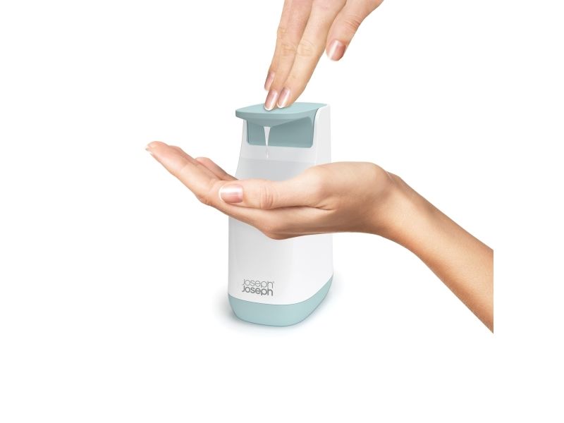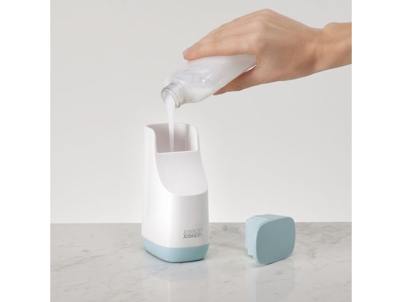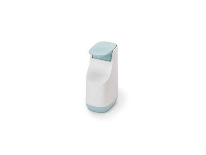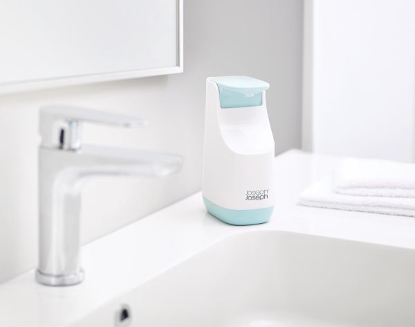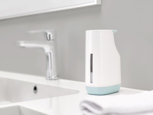 Dispenseren er lavet af slidstærk plast og rummer op til 350 ml sæbe. Således har den samme volumen som en almindelig beholder, men tager fysisk mindre plads. Selvfølgelig er der et stort hoved til behagelig presning af pumpen og et vindue, der angiver påfyldningsniveauet.