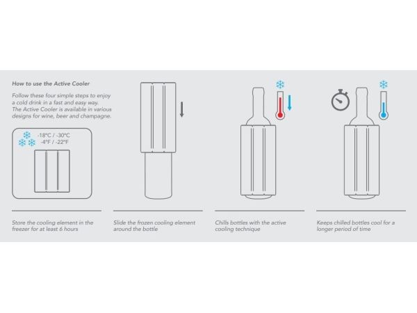 Chilling drinks quickly and keeping them cold is no longer a problem using the Active Coolers! The amazing Active Coolers can best be described as super cold flexible ice jackets. They can, when taken from the freezer, simply be slipped over the bottle. The drink will be chilled within minutes and stays cool for hours. The coolers are unbreakable and reusable.