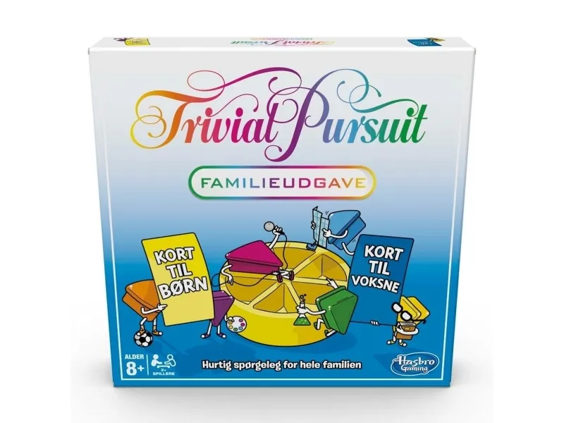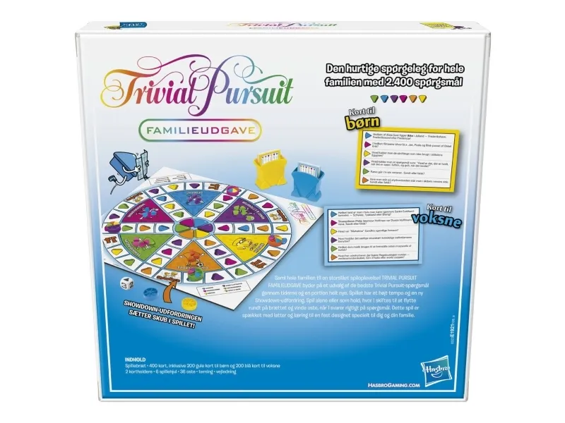 Dette er et Trivial Pursuit-spill for familier, for alle fra 8 år! Dette raske spørrespillet for familier inkluderer 400 kort med 2400 spørsmål fordelt i to kortstokker, en for barn og en for voksne. Trivial Pursuit Family Edition har nye spørsmål og høy hastighet, for eksempel i Showdown-utfordringen hvor 2 spillere konkurrer om ett kakestykke samtidig. Spill individuelt eller på lag, og svar korrekt på spørsmål for å vinne kakestykket. Familiemedlemmer kan teste hvor smarte de er med spørsmål etter spørsmål fra de 6 kategoriene: Geografi, Underholdning, Historie, Sport og Fritid, Kunst og Litteratur og Vitenskap og Natur. Bli den første spilleren, eller det første laget, som fyller spillebrikken med kakestykker fra alle kategorier og svar på et siste spørsmål for å vinne. Trivial Pursuit, logoen, den karakteristiske designen av spillebrettet, spørsmålskortene, spillebrikkene og kakestykkene er varemerker som tilhører Hasbro. Hasbro Gaming og alle tilhørende begreper er varemerker som tilhører Hasbro.