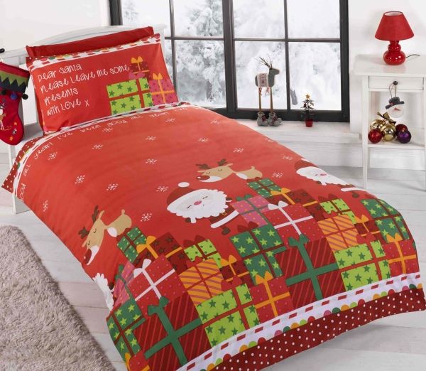 Dette børnedesign er den perfekte opsummering af alt, hvad julen angår, med julemanden og hans rensdyr sammen med stakke af gaver. Trykt på en festlig rød baggrund gør dette design den perfekte tilføjelse til ethvert soveværelse denne vinter.