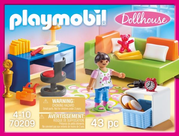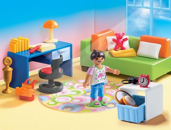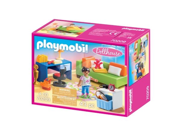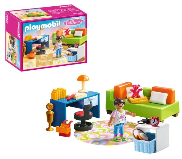 I det store dukkehus er der også et værelse, hvor teenagedatteren kan trække sig tilbage. Her kan hun lave lektier eller slappe af og læse på den seje sofa. Når det er tid til at gå i seng, bliver sofaen hurtigt lavet om til en seng. Legesættet indeholder en PLAYMOBIL®-barnefigur, en sovesofa, et skrivebord inkl. en lille notesblok med ægte papir, en reol, en stol, en lampe og mange andre indretningsgenstande samt en skoletaske og bøger. Dette værelse passer perfekt til det store dukkehus, varenr. 70205. Det nye PLAYMOBIL® legehus inviterer til kreativ leg baserende på familielivet med dens mange flotte detaljer.