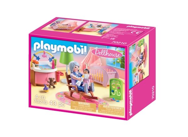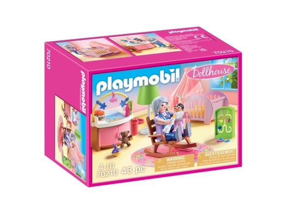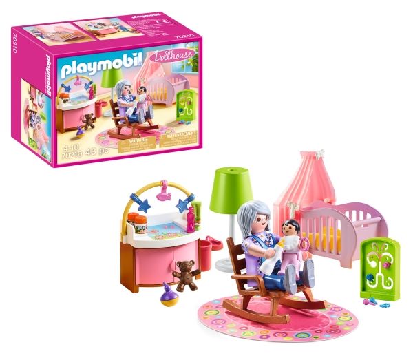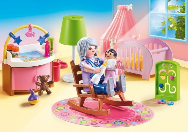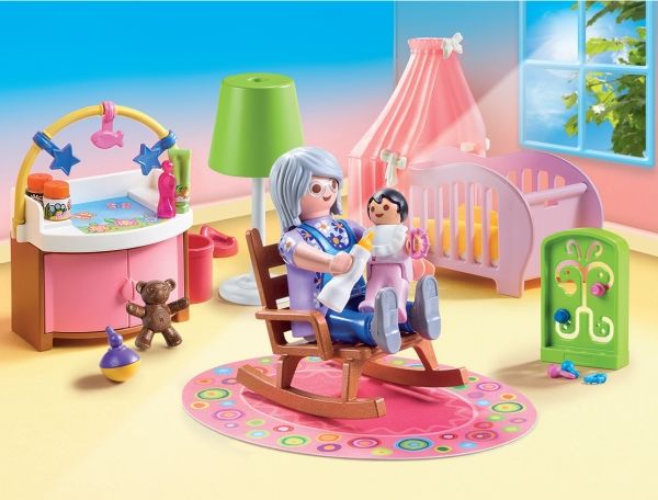 Selv det mindste medlem af familien har sit eget værelse i det store dukkehus. I børneværelset er der alt hvad en glad baby har brug for: en dejlig tremmeseng med himmel, et puslebord med aktivitetsstativ og naturligt legetøj. Når bedstemor er på besøg, sætter hun sig i den behagelige gyngestol ved siden af sengen for at fortælle historier, give mad og synge. Legesættet indeholder to PLAYMOBIL®-figurer (bedstemor og baby), et puslebord, en gyngestol, en babyseng, en standerlampe, legetøj og meget andet tilbehør. Børneværelset passer perfekt til det store dukkehus. Det nye PLAYMOBIL® legehus inviterer til kreativ leg baserende på familielivet med dens mange flotte detaljer.