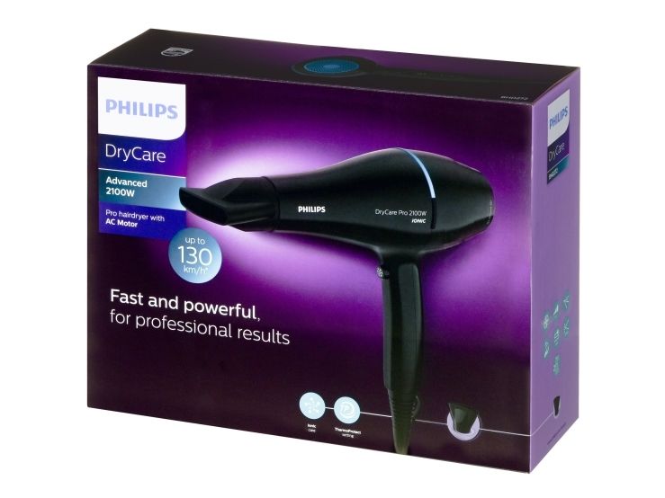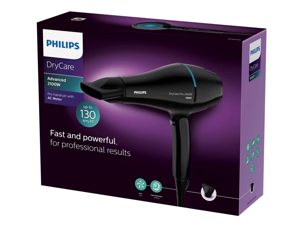 The Philips Pro hairdryer has a professional AC motor that reaches up to 130km/h of air speed for fast and professional results. It also features the ThermoProtect setting for optimal temperature to protect from overheating.