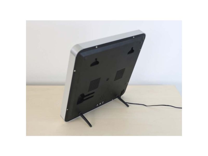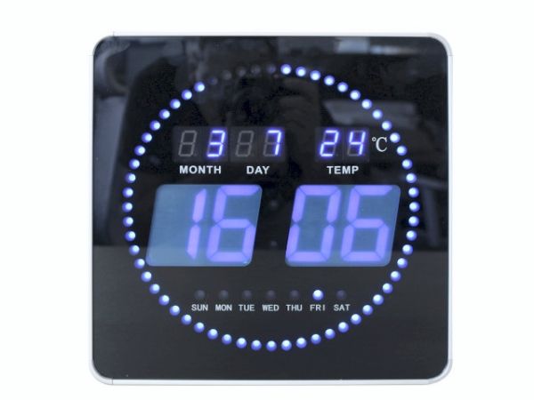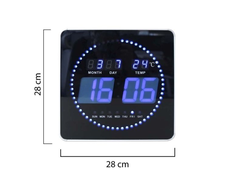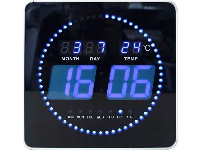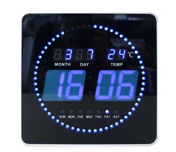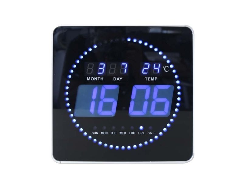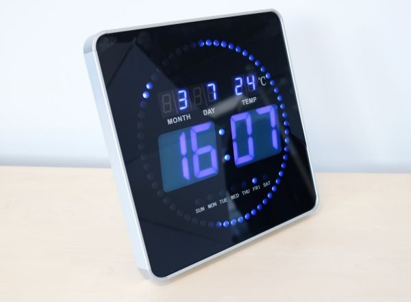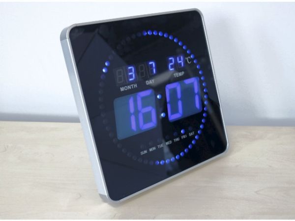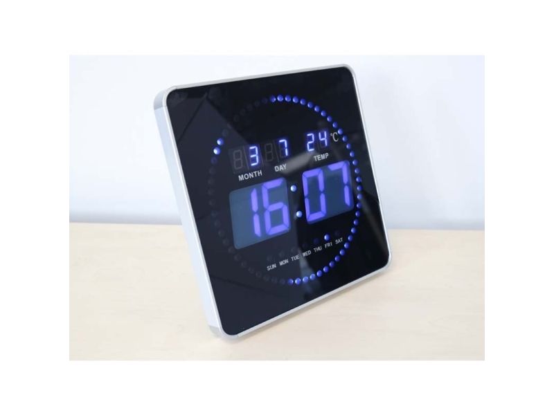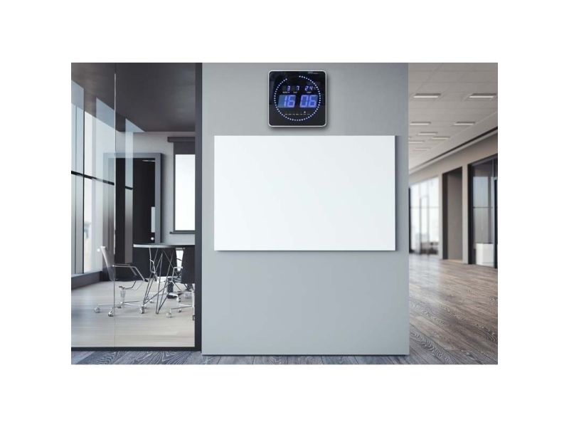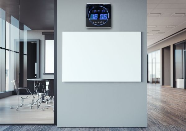 Unilux FLO er et stille LED-vægur, der giver dig oplysninger om klokkeslæt, dato og temperaturen på den omgivende luft. Takket være kontrasten ved de store digitale, blå og 6 cm høje LED-tal på sort baggrund er dette ur let at aflæse i store rum såsom receptioner eller mødelokaler.