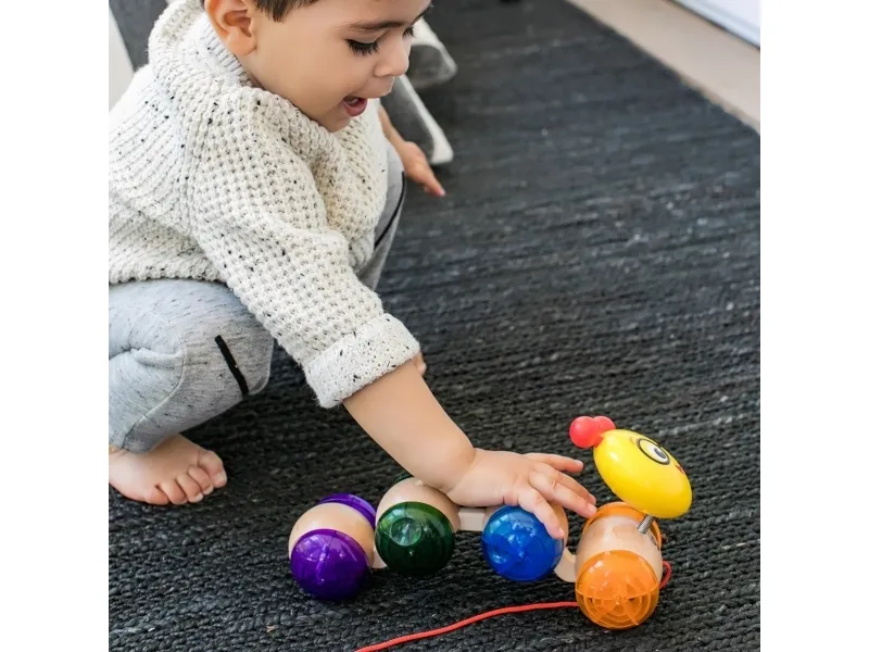 Hape træ og plastik træk-tusindben med sjove bevægelser i hovedet når du trækker den afsted. Måler 25 cm i længden.