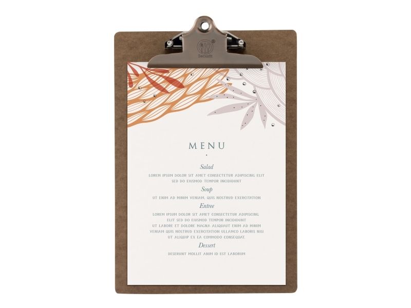• Det enkle design holder i længden med Securit® A4 Clipboard Menu Holder. Denne MDF-menuholder med e ekstra stærk metalclip passer perfekt til enhver pub, café eller restaurant. Sæt blot menuarket under klemmen og udskift det efter behov. Designet har en subtil bestikillustration på klemmen. Fuldfør looket med den matchende Securit® Clipboard Bill Presenter.