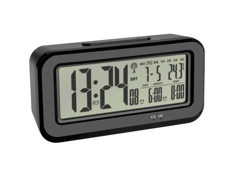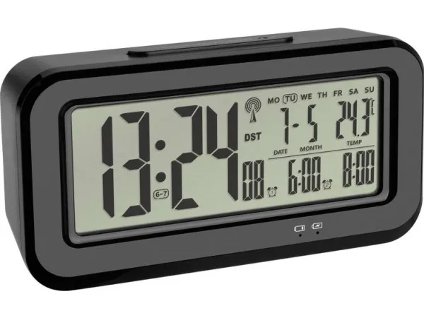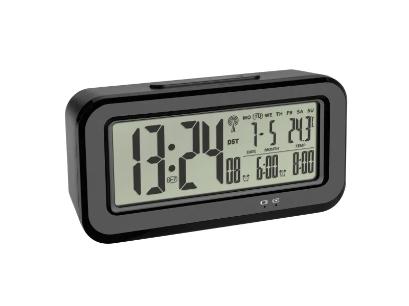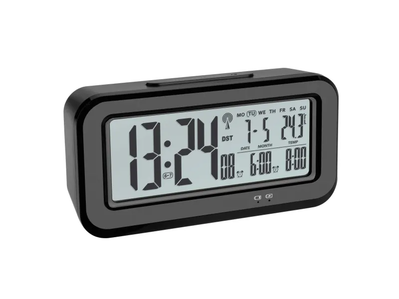 The radio-controlled clock receives the time via the DCF-77 signal. This will always give you the current time to the second, and the date and day of the week will appear without setting.