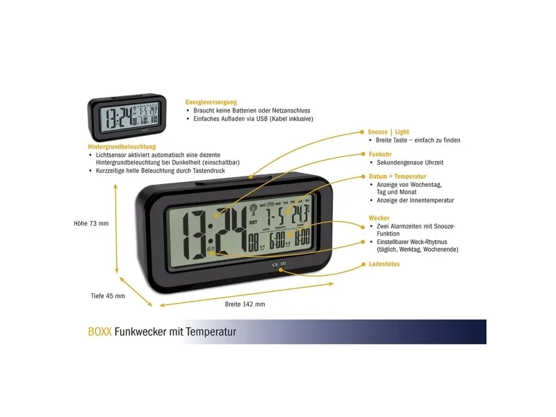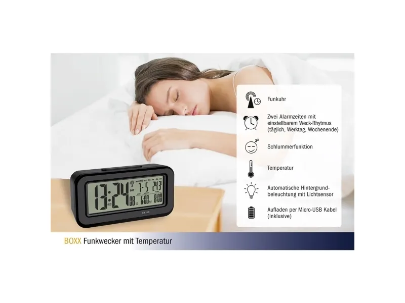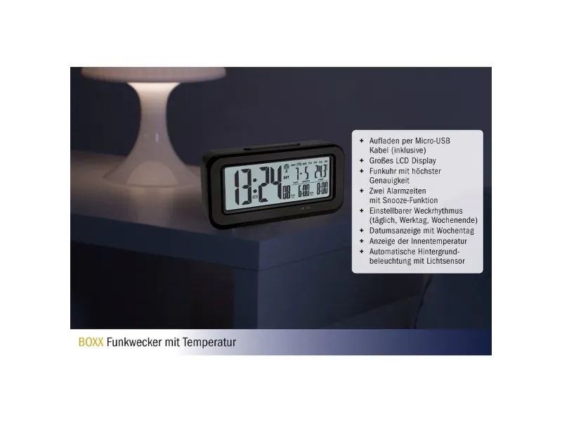 The BOXX radio-controlled alarm clock can be easily and economically charged via micro-USB cable – on the laptop, PC or with a power bank – just like your smartphone. An LED warning light indicates when the battery is running low. The correct charging cable is included.