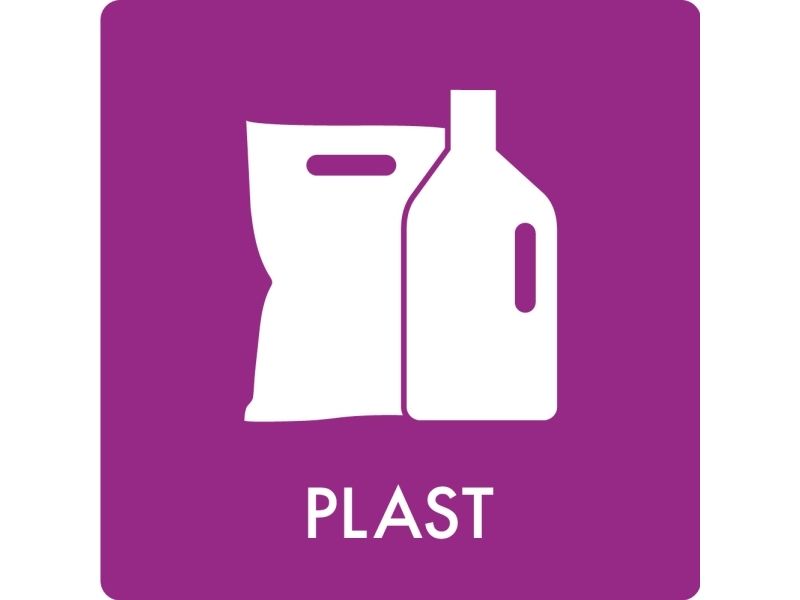 Affaldsskilt med dansk tekst 'Plast' leveres på selvklæbende vinyl i størrelsen 120 x 120 mm med Tekst og symbol, benyttes til Affaldssortering