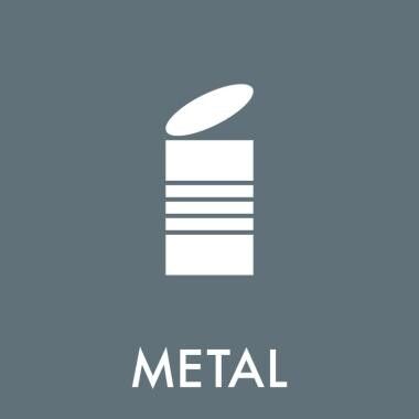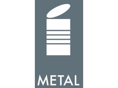 Affaldsskilt med dansk tekst 'Metal' leveres på selvklæbende vinyl i størrelsen 120 x 120 mm med tekst og symbol, benyttes til affaldssortering