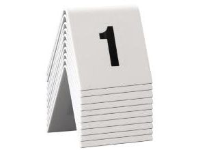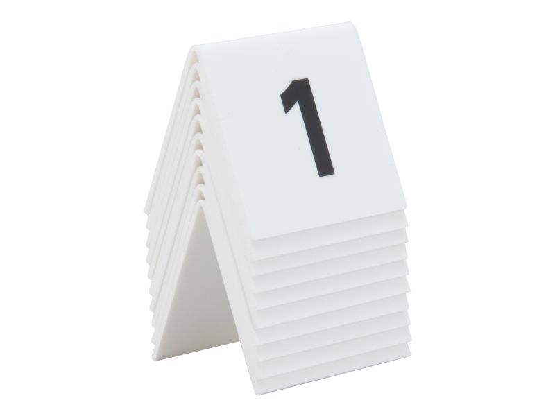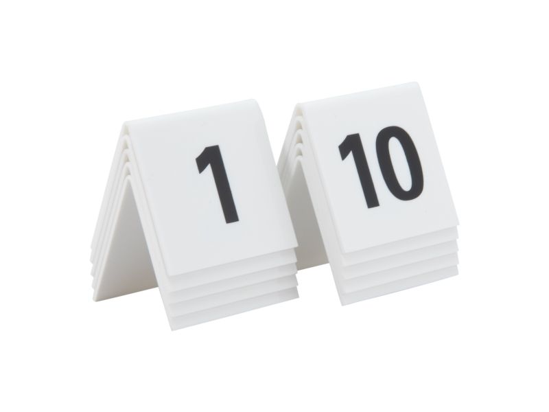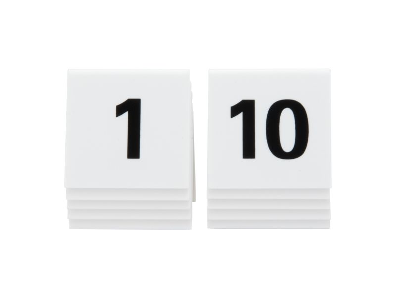 • Hold styr på dine borde med disse praktiske Securit® bordskilte. Disse hårde akryl tegn har en fed og meget læsbar skrifttype. De er lette at rengøre og er stabelbare. Dette nummersæt 1-10 er udført i samme stil som vores reservationsskilte på forskellige sprog. Brug dem sammen, så man får et ensartet udtryk. Forskellige sæt til rådighed op til nummer 60.