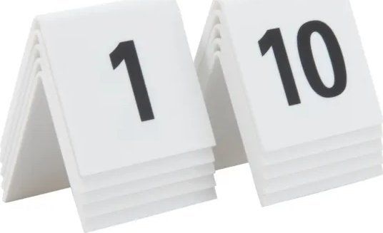 Hold styr på dine borde med disse praktiske Securit® bordskilte. Disse hårde akryl tegn har en fed og meget læsbar skrifttype. De er lette at rengøre og er stabelbare. Dette nummersæt 1-10 er udført i samme stil som vores reservationsskilte på forskellige sprog. Brug dem sammen, så man får et ensartet udtryk. Forskellige sæt til rådighed op til nummer 60.