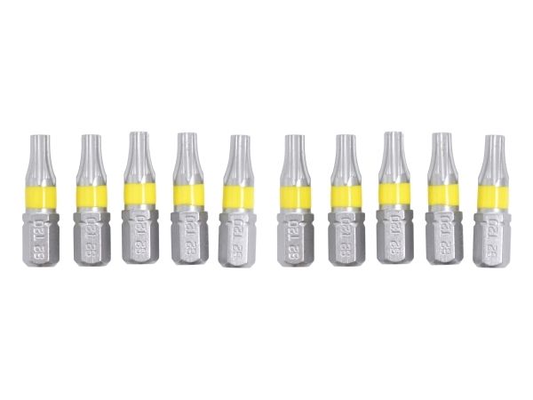 Hver bit er lavet af slidstærkt S2 stål og har en længde på 25 mm og 1/4" størrelse. De har en præcis kærv, der gør det let at fastgøre og løsne skruer i forskellige størrelser.