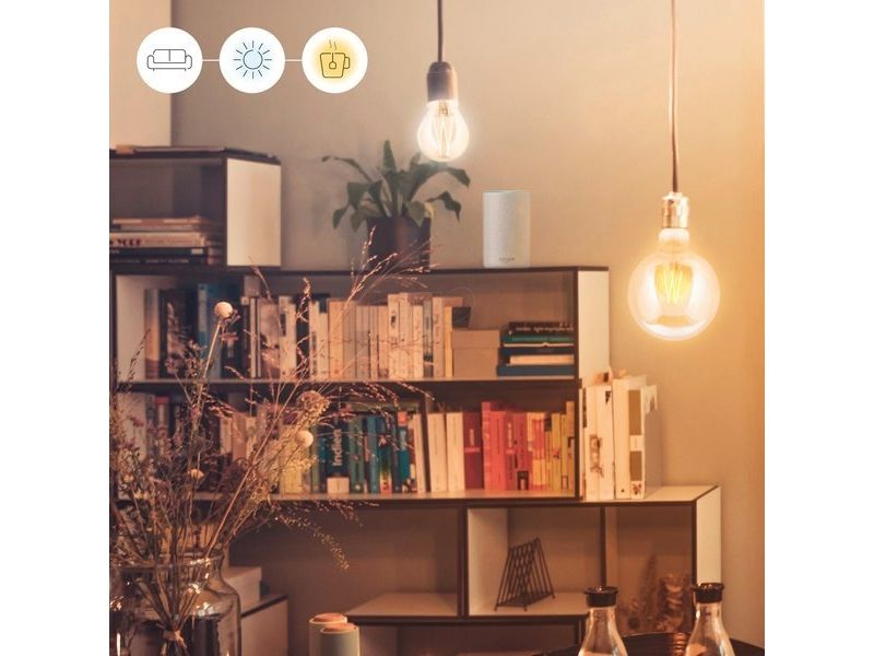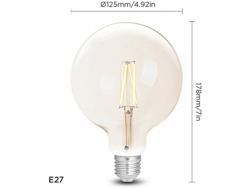 The Filament Clear G125 is a big globe shaped bulb with visible LED filaments, clear glass and in this case the E27 socket. The Filament Clear G125 bulb can be adjusted from cold to warm white and dimmed down or turned up high in effect through the Wi-Fi connected App on your smartphone.
