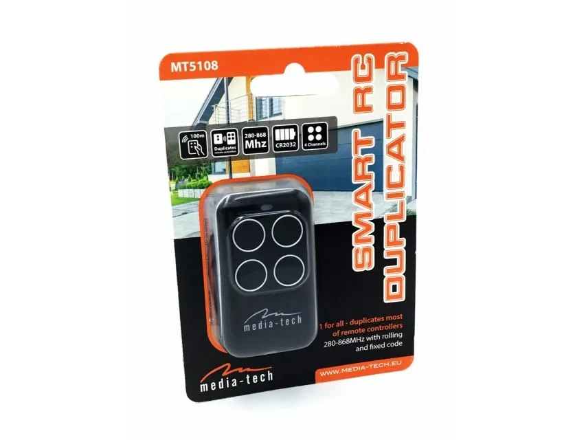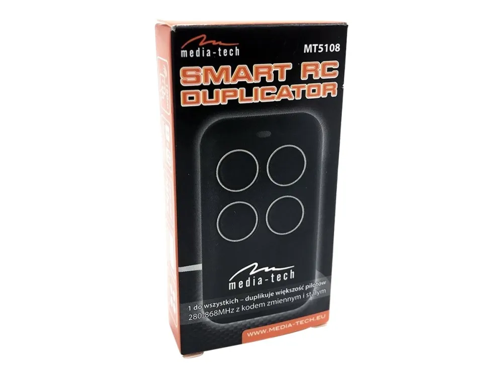 The SMART RC DUPLICATOR MT5108 is an universal self-copying remote control - 1 for all - duplicates most 280-868MHz remote controls with variable and fixed code.\nSMART RC DUPLICATOR supports a wide frequency range, making it the most universal remote control available on the market, capable of copying over 300 different models of remote controls.\n\n4 channel remote control operating at 280-868MHz. It allows you to copy five codes in total (it is possible to configure two buttons simultaneously, which will act as one separate, fifth channel).\nIf you have two or three different remote controls working at different frequencies, with different codes, you can operate them all with one SMART RC DUPLICATOR MT5108 by configuring the buttons responsible for each remote control.