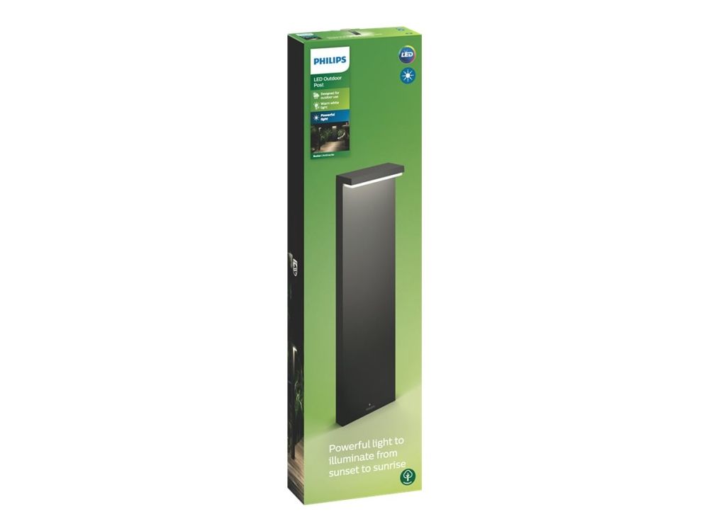 Et vakkert L-formet lys. Denne minimalistiske Philips Bustan-stolpelys i antrasittgrå aluminium av høy kvalitet, kaster fra seg et diffust varmhvitt LED-lys som passer utmerket for å lyse opp en gangsti eller terrasse.
