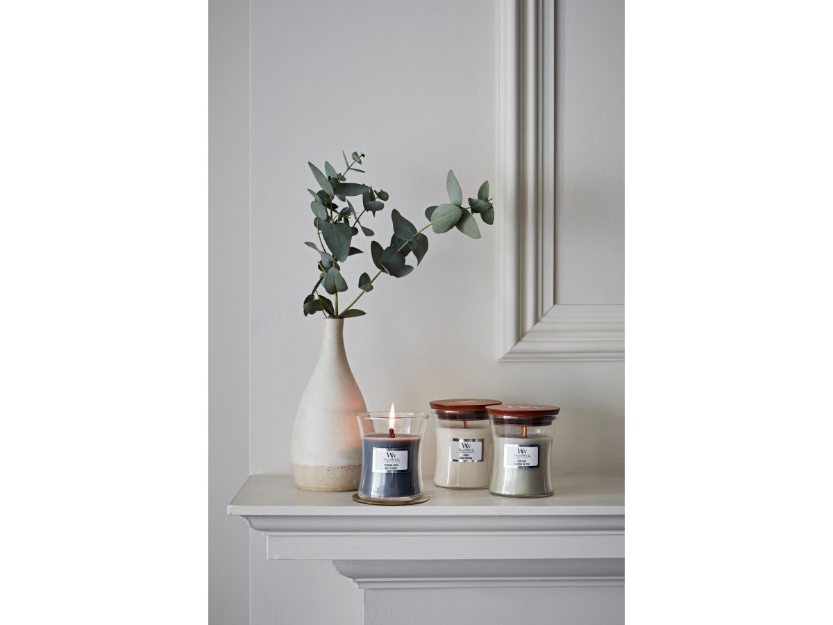 Medium Hourglass Woodwick Candles fill your home with the soft crackle and inviting scents and a natural wooden wick that Crackles as it Burns. The soothing crackle of a WoodWick® candle is created by a patented PLUSWICK Innovation technology, designed to ensure a safe and consistent crackle experience for faster fragrance and a better burn while fragrancing your home with the soothing sound of a crackling fire. (3.88" x 4.5")