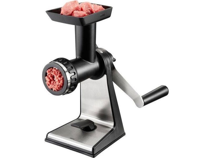 Using the multifunctional meat grinder, meat and veg is easy to grind with little effort. Sophisticated engineering, including the special design of the conveyor screw, the self-grinding knife or the interior thread ensures perfect results. The supplied sausage stuffer makes it easy to fill cannelloni as well, and the spritz biscuit attachment gives cookie dough the perfect shape. A safe stand is guaranteed by the suction foot or the table clamp which can be fixed to worktops up to 8 cm thick. The pusher ensures every last scrap of material is processed and serves to fasten and loosen the meat mincer’s lock nut.GEFU TRANSFORMA. Product colour: Stainless steel. Housing material: Plastic, Stainless steel. Width: 302 mm, Depth: 134 mm, Height: 291 mm