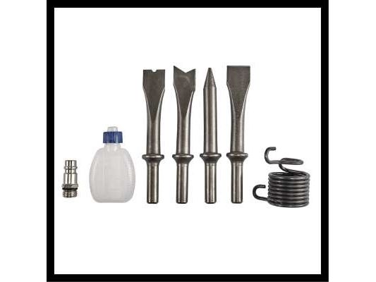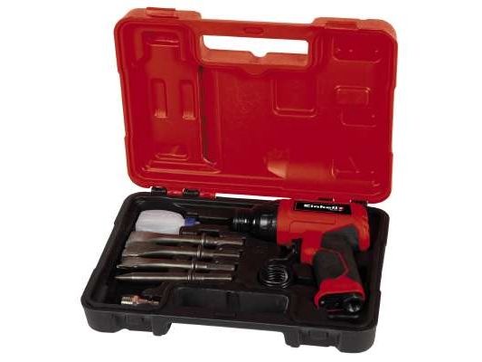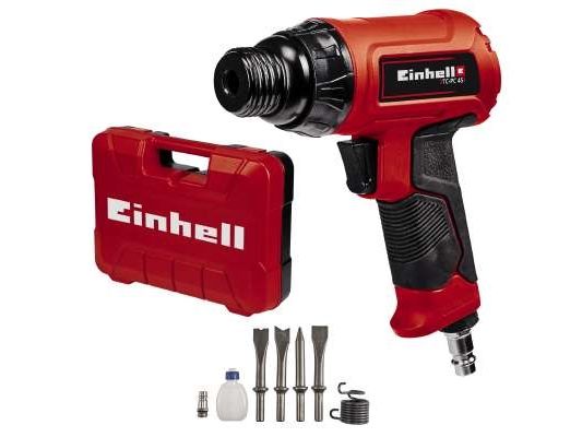 The Einhell TC-PC 45 pneumatic chisel hammer is a powerful and endurable assistant for tackling stone or metal materials on demolition and renovation jobs inside and outside the home. For working in safety it has a non-slip rubberized handle with a user-friendly design. With a maximum operating pressure of 6.3 bar the tool delivers a blow rate of up to 4500 min^-1 for an impact power of up to 1.2 joules. The chisel is held securely by the hexagon chuck. Top performance is offered by the robust air chisel hammer using a hose with an inner diameter of 9 millimeters or over. Thanks to its versatility there is practically no end to the potential uses for the tool. The scope of delivery therefore includes not just the four-piece 120 millimeter chisel set for numerous applications but 1 small oil bottle, 1 nipple and 1 tension spring as well. Supplied in a practical transport and storage case.