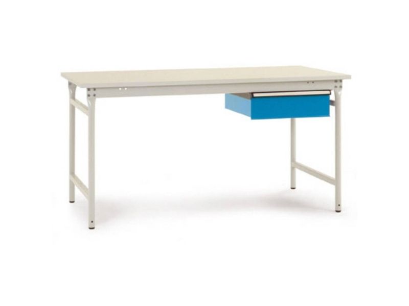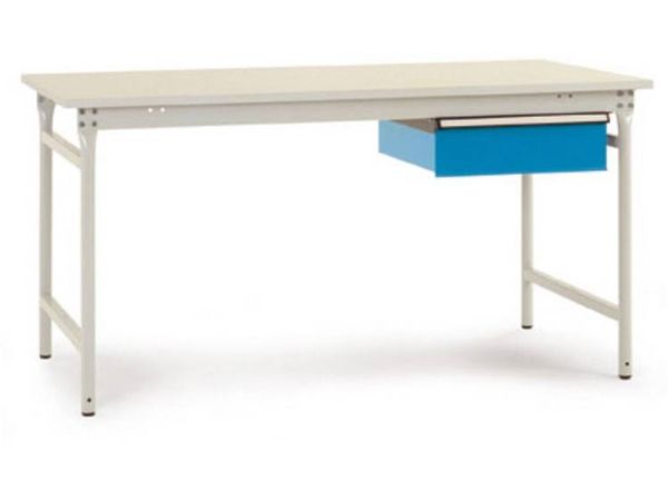 Komplet natbord BASIS stationært med melamin-plade + enkeltskuffe, B x D x H: 1000 x 800 x 780 mm Det komplette natbord er stationært med melamin-plade og enkeltskuffer er et billigt og fleksibelt bord til mange forskellige anvendelsesformål. Bæreevnen på 350 kg ved ensartet fordeling af byrderne er i overensstemmelse med kravene til enkle mekaniske, produktionstekniske eller prøvningstekniske opgaver i produktion, lager, montage, laboratorier og levering. Spar tid og penge ved at bestille en praktisk, komplet udgave. På grund af den enkle montering er natbordet med det samme. Ved anvendelse af en enkelt skuffe får du desuden orden og overblik på arbejdspladsen. Skuffeum er fremragende egnet til optagelse af værktøj. De enkelte skuffer med en blændehøjde på 150 mm er forsynet med en lås og kan monteres enten til venstre eller højre. På grund af den forstærkede ståludførelse er enkeltskuffen yderst stabil og vridningsfri. Skuffen er rullevlejret og kan trækkes ud op til 60 %. Bunden er perforeret i en 36 mm raster. Den har en stor sort, praktisk grebsliste med en skriveetiket og gennemsigtig afdækning. De enkelte skuffer har en kapacitet på 25 kg. Enkeltskuffen har en bredde på 425 mm, en dybde på 550 mm og en blændehøjde på 135 mm. Den er fremstillet af stål og har huller i 36 mm raster. Skuffen i enkeltskuffe er med førsteklasses pulvercoatet, klar blå RAL 5007 med førsteklasses pulverbelægning. Den stabile stålramme består af 33 mm dia. Rundrørsfødder og 60 mm høje zarver. Stellet er pulverbelagt i høj kvalitet i lysegrå RAL 7035. Sidebordet HAR en bredde på 1000 mm, en dybde på 800 mm og et samlet højde på 780 mm. Derudover har det komplette omstillingsbord BASIS jordudlignings-skruer, som kan udligne ujævnheder på op til 10 mm. Den lysegrå melamin-bundplade, 22 mm stærk, 1000 mm bred og 800 mm dyb, består af en Melaminharpiksbelægning på E1 (emissionsklasse 1) 3-lagspændeplade med finstruktur på begge sider. Melamin-bordpladen er overvejende slid- og ridsefast og blændfri. Den glatte overflade er let at rengøre. Bordpladen er egnet til arbejde uden højere mekaniske og kemiske krav.