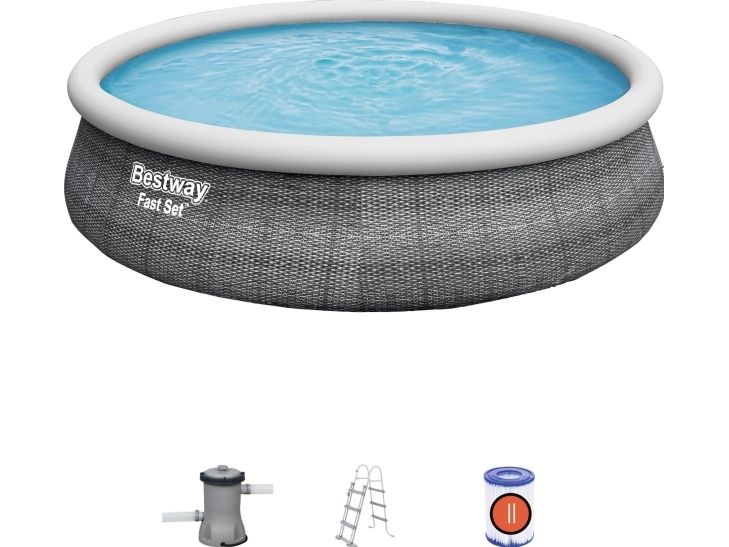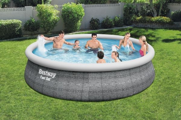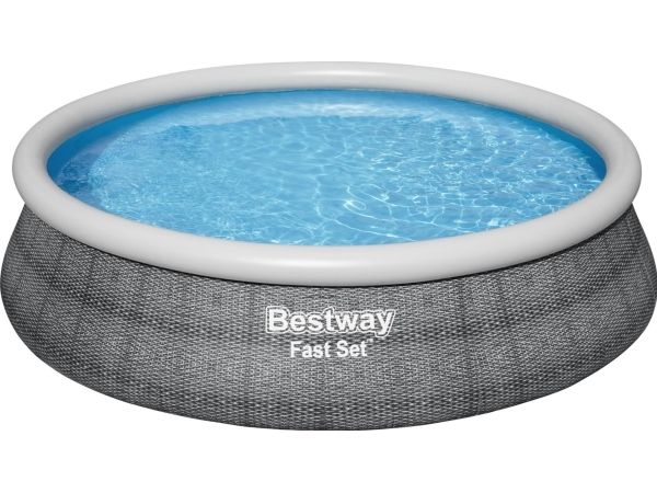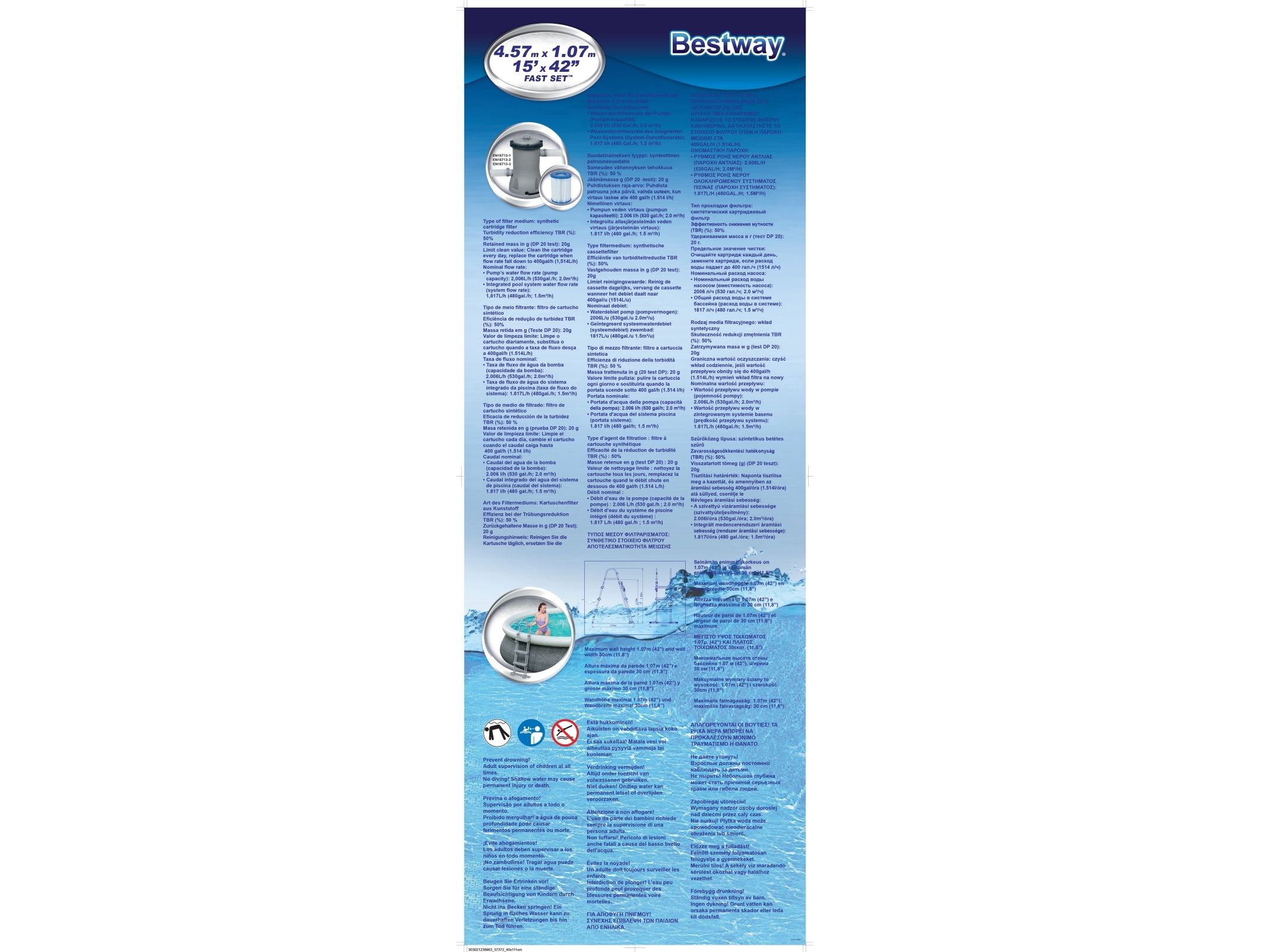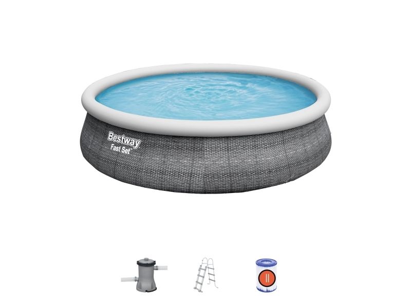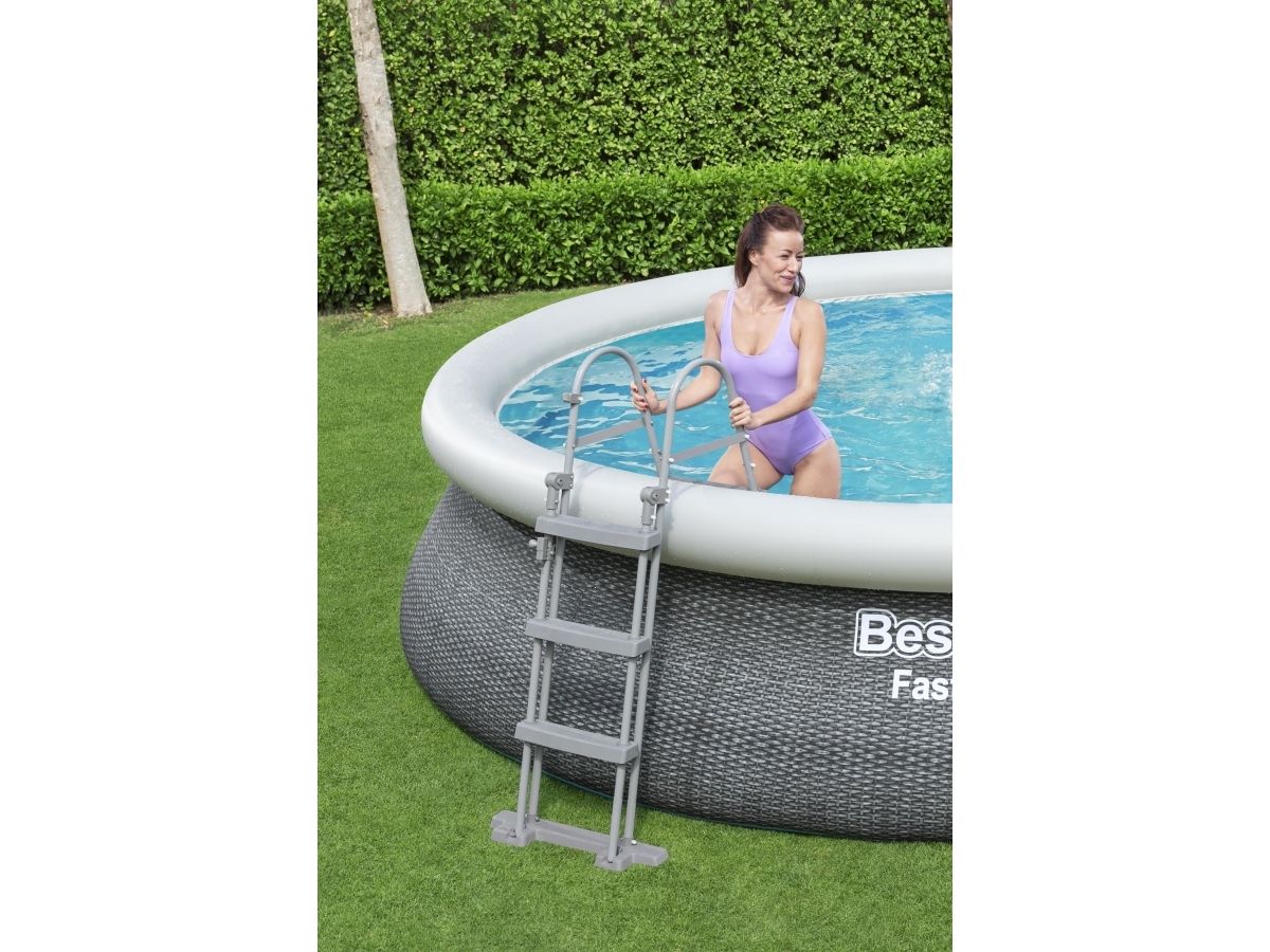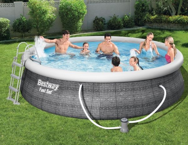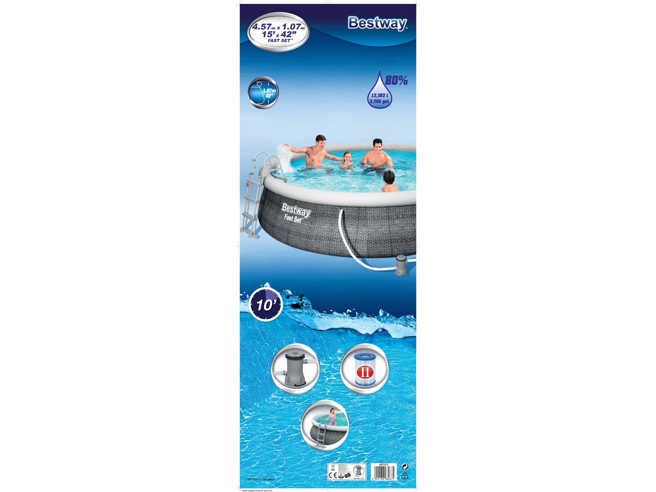 Bestway® Fast Set ? -poolen er hurtig og nem at installere, og den kræver ikke noget værktøj for at få arbejdet gjort! Processen er enkel - vælg bare en plan overflade, pump den øverste ring op, og poolen rejser sog, når den er fyldt op med vand. Den robuste Tritech ? -foring er lavet af et holdbart materiale, der er forstærket for styrke og punkteringsmodstand. Den attraktive foring har også et realistisk print, der giver et elegant look og fornemmelse i din baghave. Når sæsonen er forbi, er opbevaring hurtig og enkel. Vandet frigøres let gennem flowreguleringsventilen, og derefter kan poolen foldes sammen kompakt opbevaring i lavsæsonen. Start sommeren med en Fast Set-pool fra Bestway! Størrelse: 4.57 m x 1.07 m Vand Kapacitet: (80%): 12,362 L Nem 10-minutter opsætning Realistisk gprint giver et elegant look og oplevelse i baghaven. Kraftige 3-lags sidevægge i PVC og polyester De ekstra stærke sidevægge på dette bassin er opbygget i Tritech?, et 3-lags armeret materiale med en kerne af polyesternet mellem to lag kraftigt PVC-materiale. Indbygget aftapningshane til flowstyring gør det nemt at aftømme ved at sætte ventilen til en haveslange (med den medfølgende adapter), så vandet ledes bort Foringen støttes af en oppustelig topring Vælg et vandret og jævnt underlag, pust topringen op, og poolen hæver sig i takt med, at den fyldes med vand Nem at afmontere til opbevaring uden for sæsonen Medfølger Flowclear-filter pumpe som klarer 2.007 liter i timen. Medfølger: Pool, Filterpumpe og stige