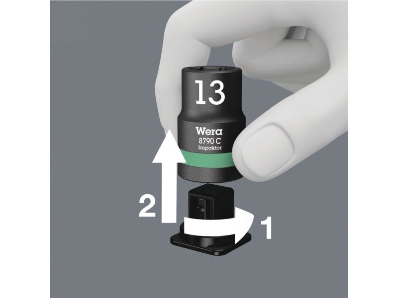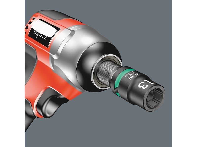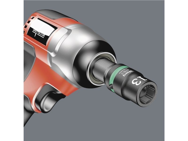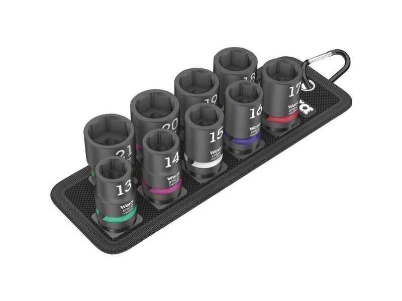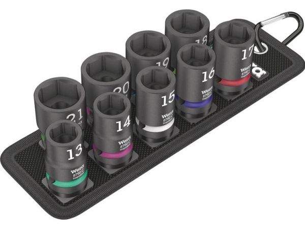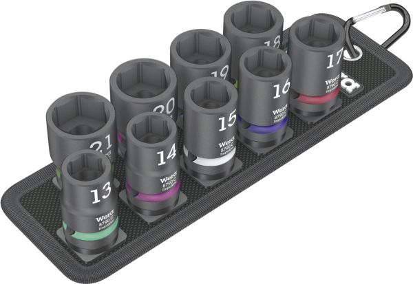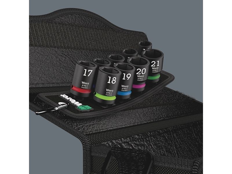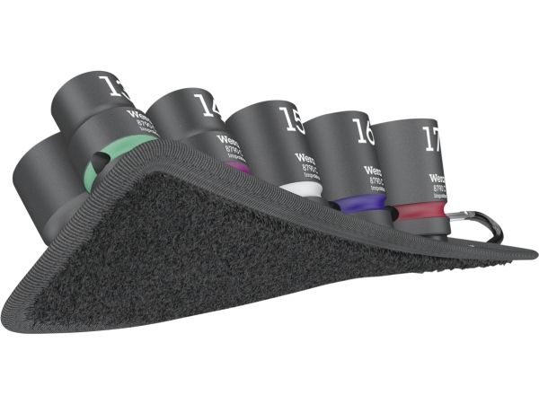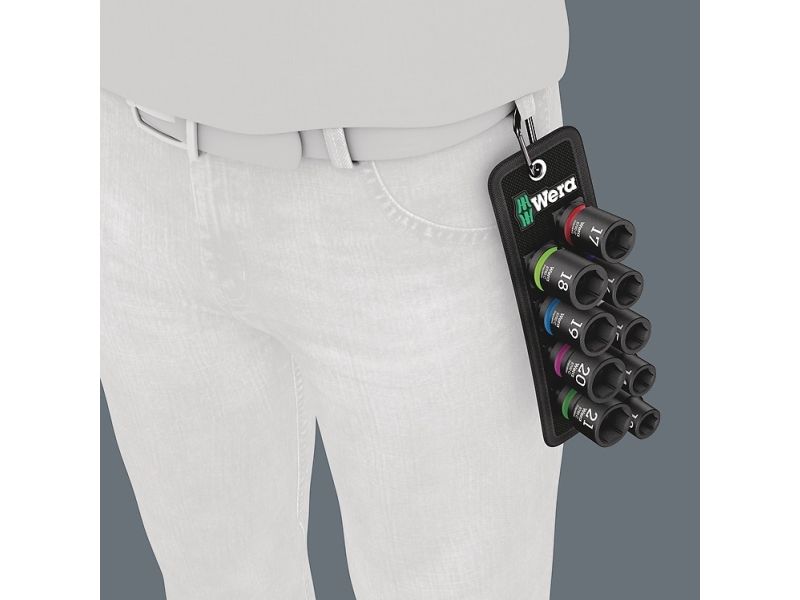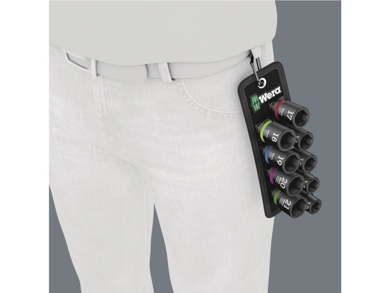 Robust textile belt in the typical Wera design with nine Impaktor socket wrench plug-ins for missions in confined spaces. A smooth Twist to Unlock mechanism ensures a secure fit and simple removal of the sockets. Including snap hook for attachment on belt loops or bags. With fleece backing and hook and loop fastener strips for easy attachment e.g. on wall, shelf, workshop trolley and Wera 2go tool transport system. Impaktor sockets for use with electric or pneumatic powered impact wrenches with 12.5mm = ½“ drive. Impaktor technology ensures above-average service life, even under extreme conditions. With Take it easy tool finder with colour coding by size - for easy and fast location of the required tool. With hexagonal profile and grooved socket. The hexagon profile allows the transmission of high forces and puts less strain on the edges of bolts or screw heads than a double hexagon profile. For external hexagonal bolts and sockets.