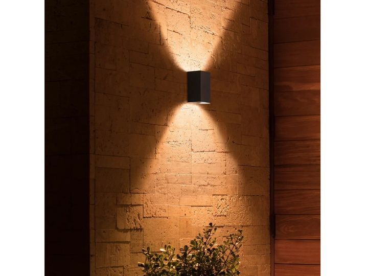 Resonate vegglampe i sølv avgir lyset i en trekantet lyseffekt både opp og ned, og belyser elegant inngangsparti og terrasser med fargerikt lys.