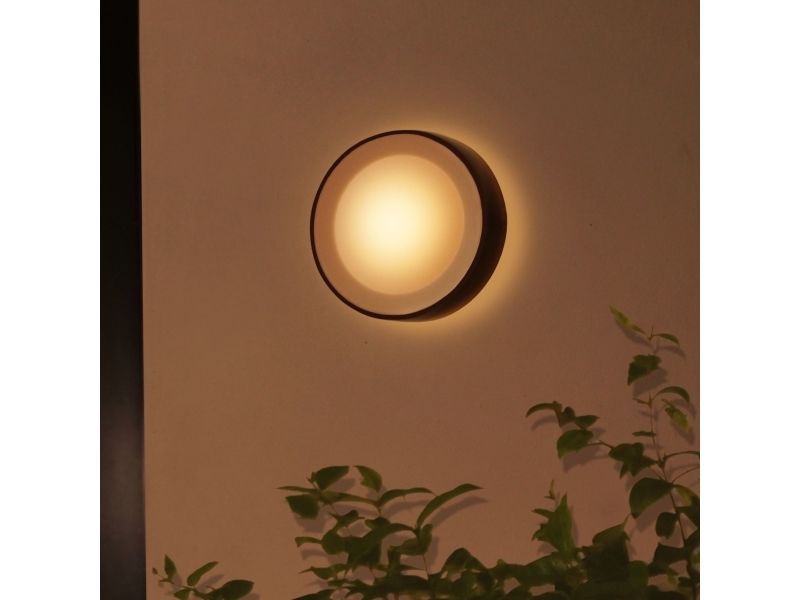 Gi fasaden en ring av lys av med Daylo vegglampe - et rundt utendørs lysarmatur som avgir 16 millioner farger. Lyset er mykt og diffust, og avgir en subtil bakgrunnsbelysning bak lysarmaturet.